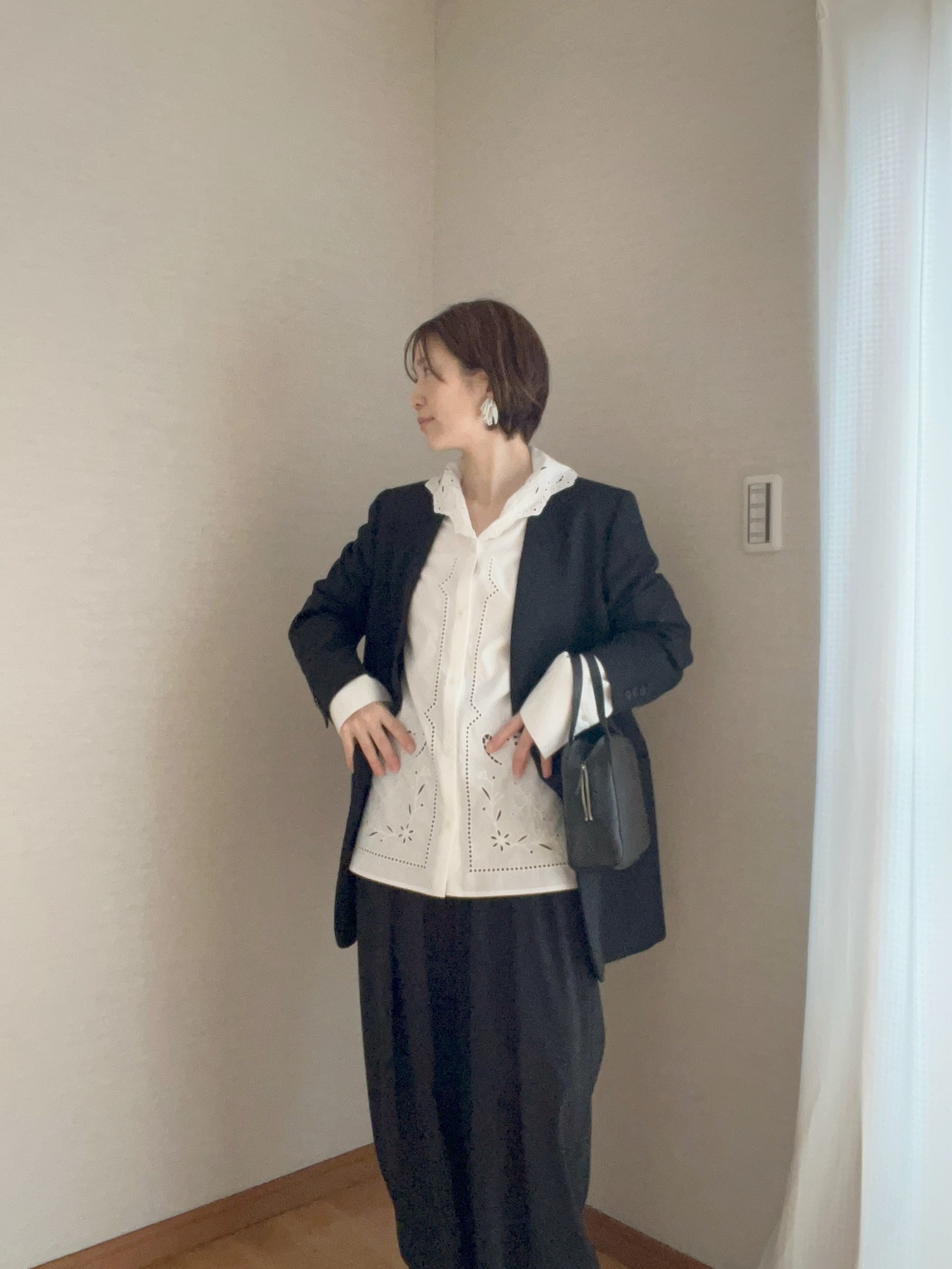 「晴れやかな場にふさわしい、明るい印象のワントーンコーデに。白系のノーカラージャケット+スカートは私には甘過ぎると感じたため、あえてダブルのボクシーなシルエットのテーラードジャケットとワイドパンツを選びました。
