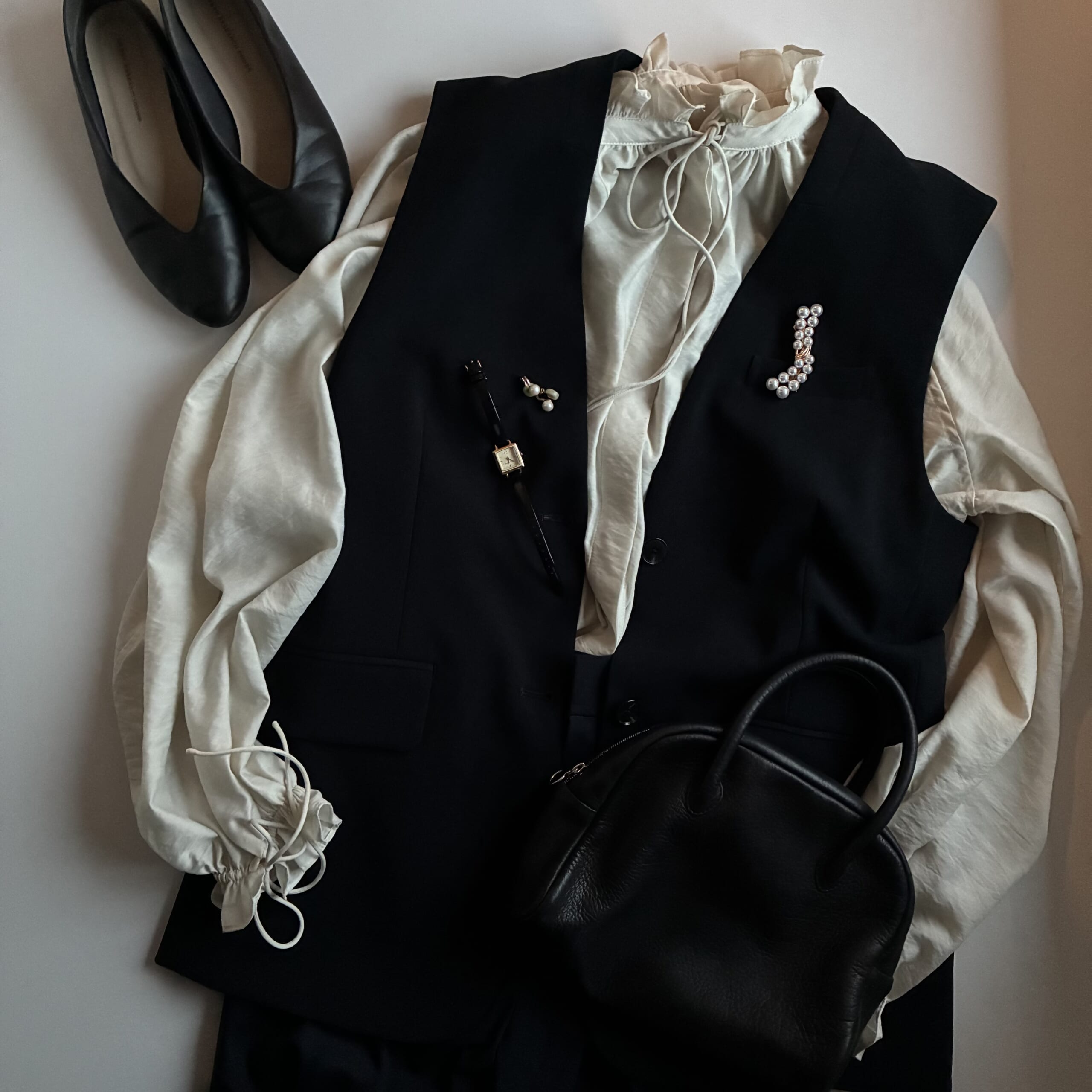 黒ベストに「着映えリボンブラウス」で華やぎを