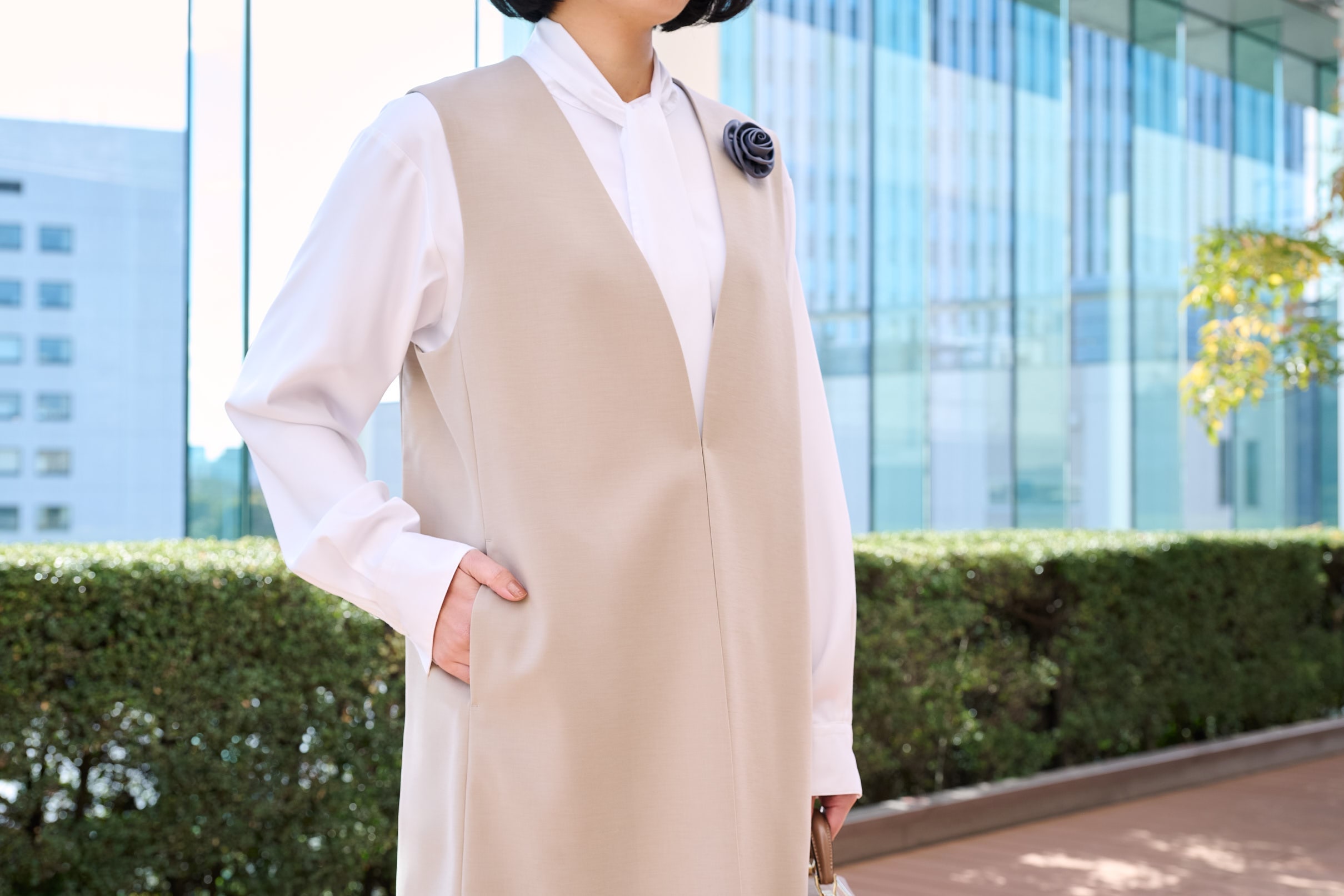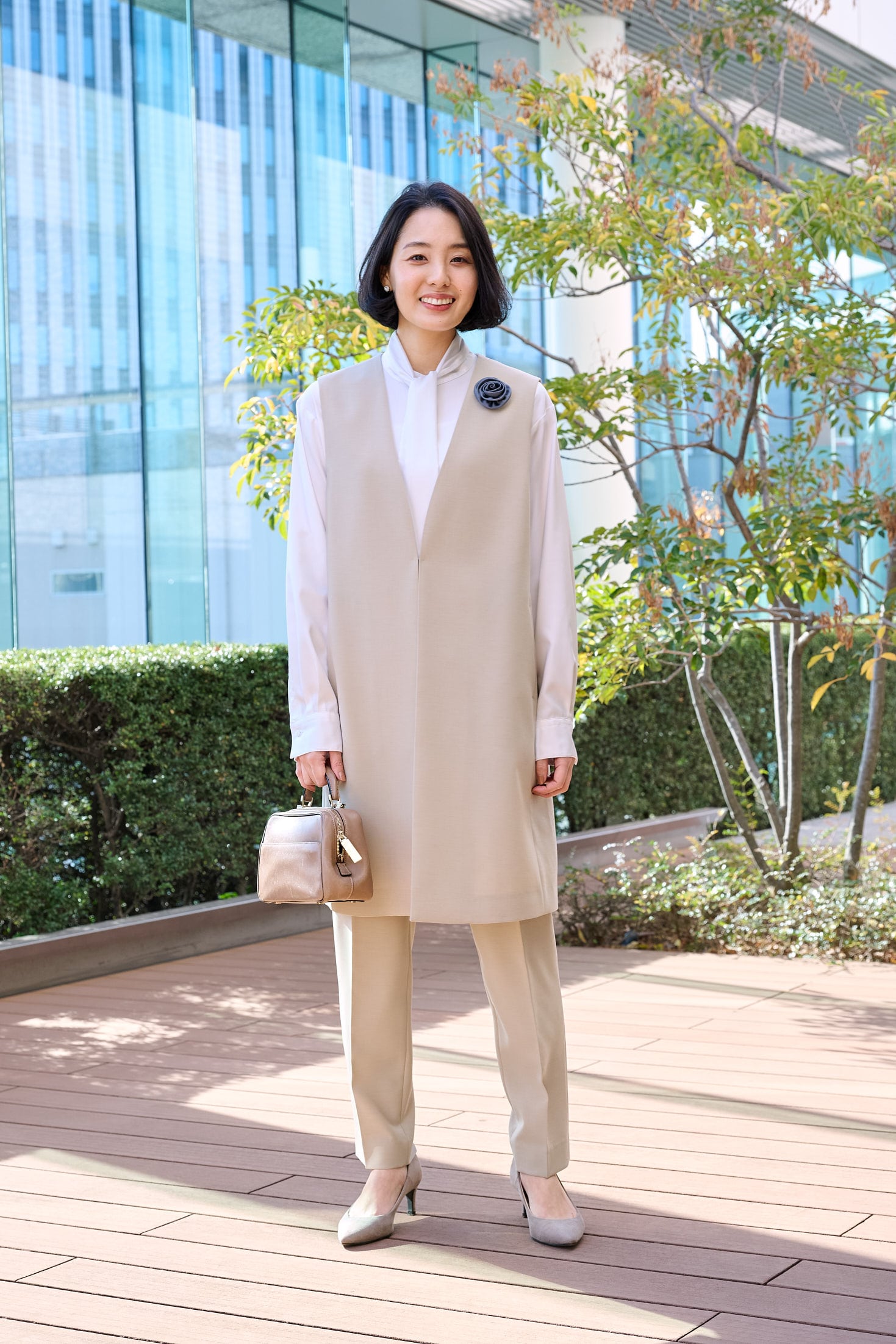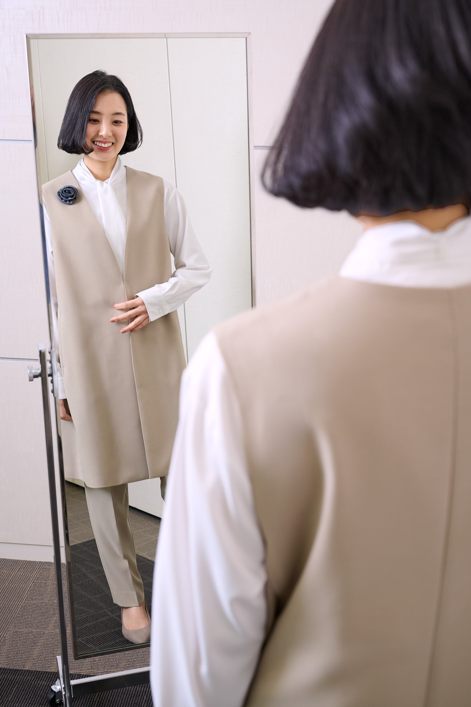 スーツブランドらしく、着心地の良さ、生地のマットな光沢、仕立ての美しさに納得感がありました。誰が見ても上品に映える佇まいで、セレモニー会場の空気にすっと馴染みつつ華を添えてくれる印象。細身のパンツと丈長めなジレの引き立て合う組み合わせは、鏡越しに見ても端正で写真写りも安心です。