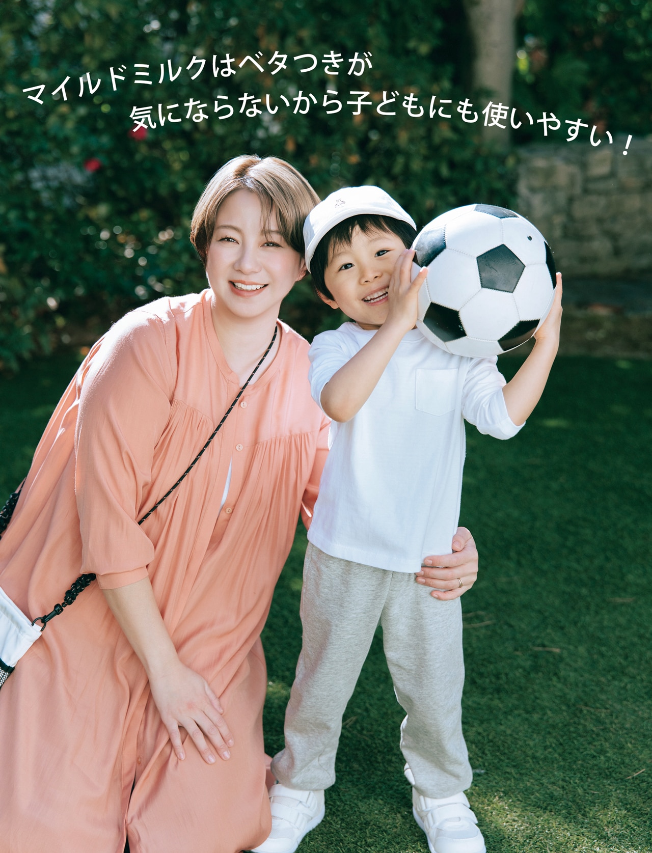 「子どもと公園や海に行くときは、汗や水に強いウォータープルーフタイプのミノンUVマイルドミルクが頼りになります。4歳と6歳の息子もそういう日は“日焼け止めを塗る”ってわかっているみたい。親としては子どもの肌にも使えるかというところがとても気になるので、肌へのやさしさを考えたミノンが好印象です。UVカット効果がしっかりあるのに白浮きせずに塗りやすいミルクタイプだから、サッカーをして汗をかく夫にもすすめたいです。」(田中美保さん)