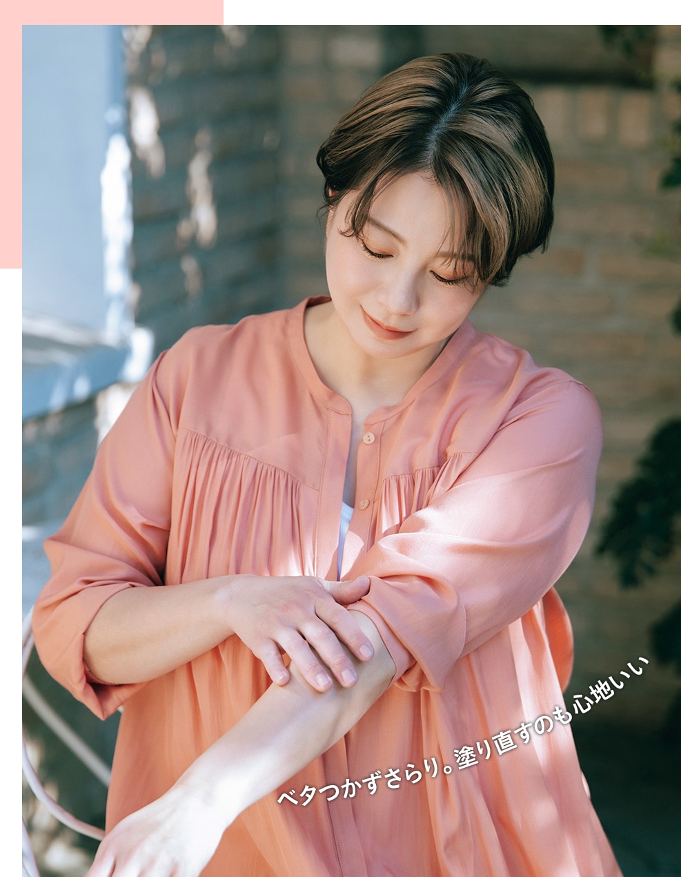 「“ちゃんと日焼け止めを塗っておけばよかった!”と後悔するくらい、年齢を重ねるごとにシミが気になって、遅ればせながらきちんとUVケアをするようになりました。メイク前に日焼け止めを塗るんですけど、毎日のことだからテクスチャーはすごく大事。ミノンのUVマイルドジェルは、すっとのびるのにきちんとUVケアできるし、肌へのやさしさを考えた日焼け止めだから花粉などの外部刺激で肌がゆらぐ時期にも手が伸びます。子どもと一緒に使えるのもうれしい!」(田中美保さん)