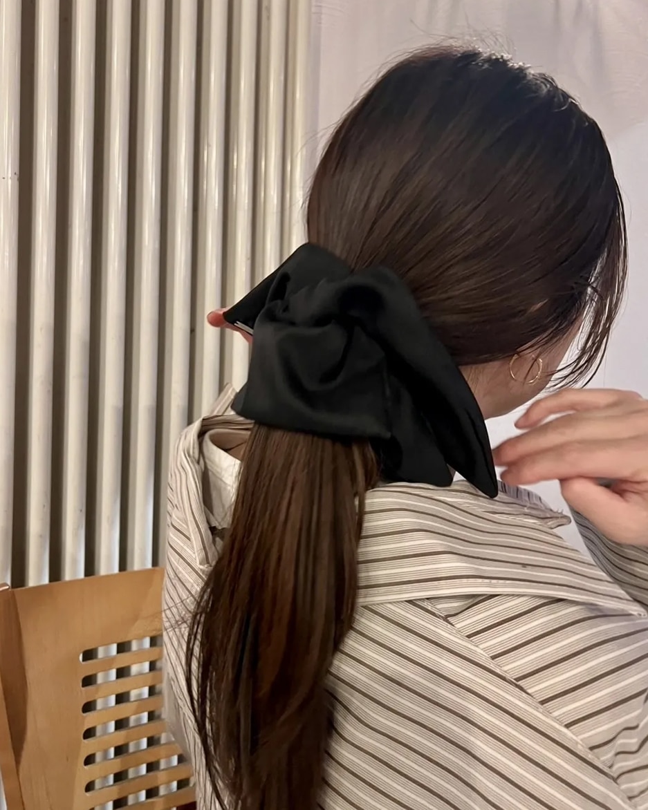 日本のオンラインショップで見つけたものですがheyepという韓国のブランドみたいです。結ぶとちょうどいいボリュームでちょっと雰囲気出るかなと。これはお出かけのときに使います。