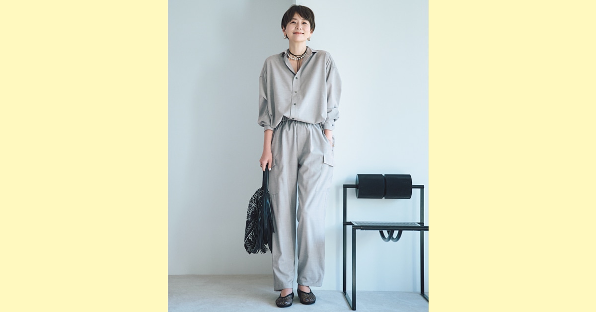 ライトグレーのセットアップ。パンツの裾を絞らずに着用すると、大人っぽさと品のよさが引き立つ/明日なに着る?