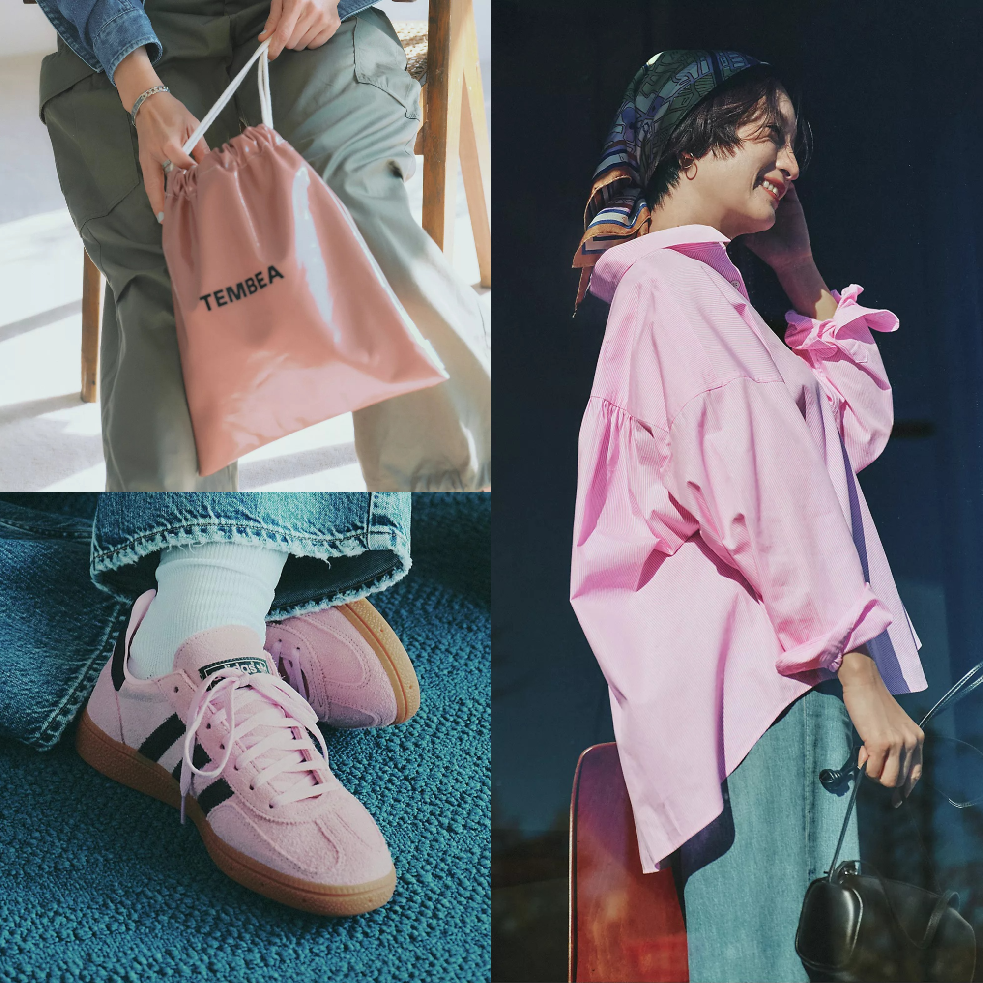 ピンク小物の人気は継続。この春選ぶなら、クラシックなデザインのスニーカーや巾着バッグ……ちょっとレトロな雰囲気をまとったアイテムがおすすめ。少し懐かしいデザインがこなれたコーデに一役買って。