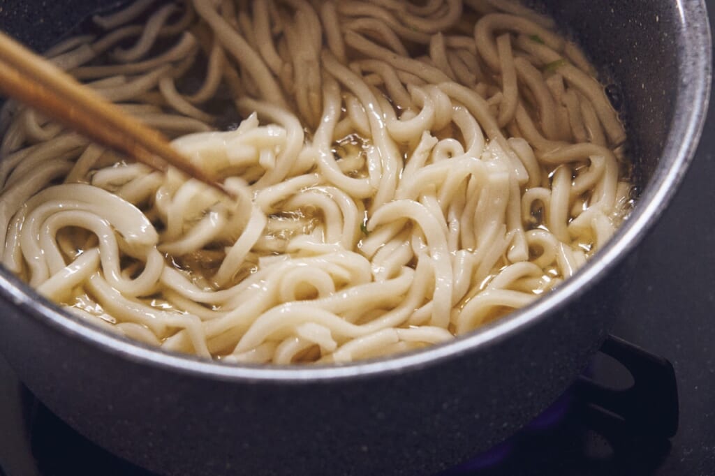 300mlの水をお鍋に入れて沸騰させて、ヒガシマルうどんスープを溶かし、茹でうどんをほぐれるまで煮て器に盛り付けます。