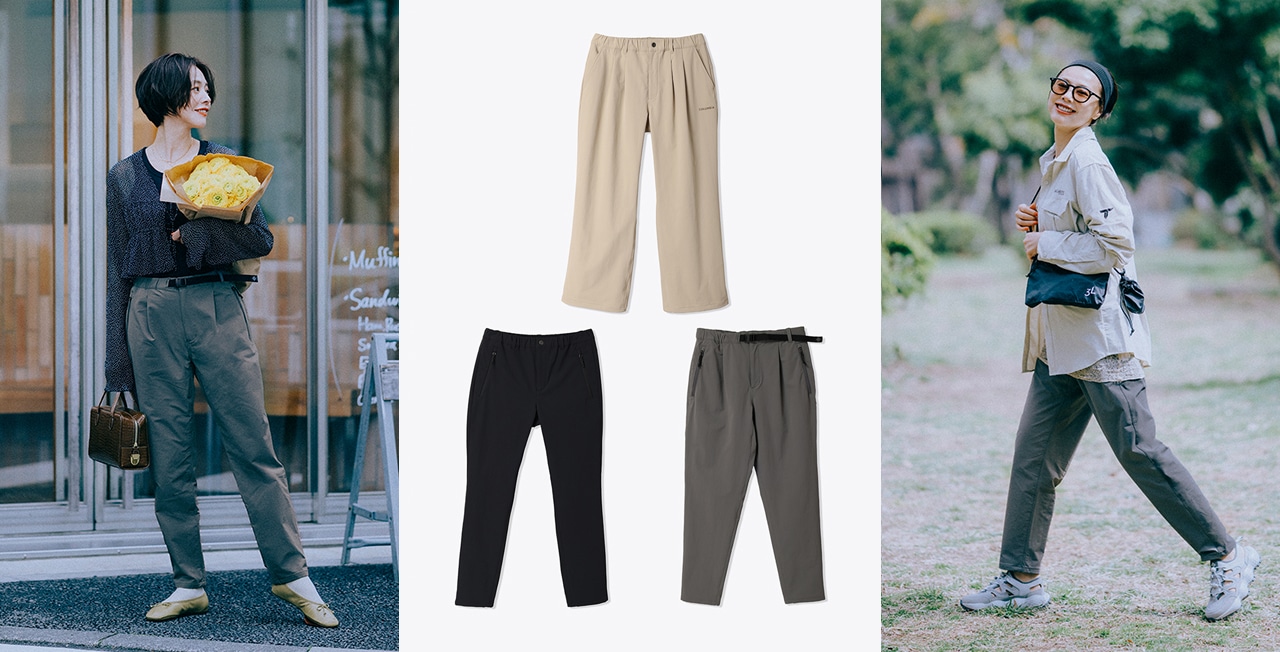 「もっとも汎用性が高く、シーンレスに使えるのが、テーパードのグレー(左)。両サイドにタック入りで、お腹まわりに余裕があるのに、ゆるすぎないテーパードシルエットだから、都会的な着こなしにもフィットします。アウトドアブランドならではのウェビングベルト使いもポイントに。