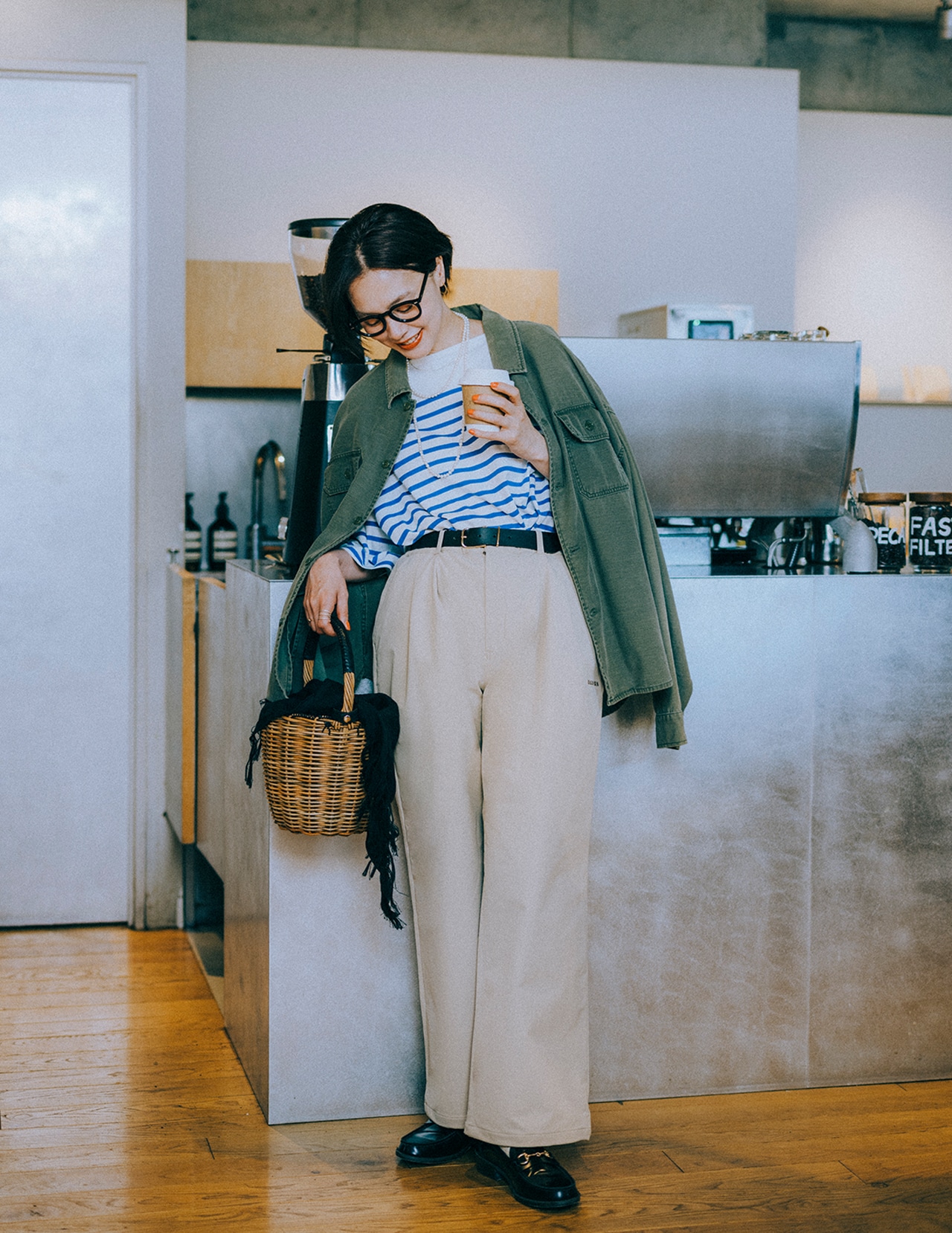 「いつものチノパン代わりに、ヤマジェニックパンツのワイドタイプのベージュを投入。二重織りのしっかりとしたマット生地が、落ち感も美しく、脚をすらりと長く見せてくれます。いつものボーダーシャツを主役にしたフレンチコーデが、シワになりにくい洗練パンツのおかげで、よりきれいめかつ都会的に!」(高橋さん・以下同)