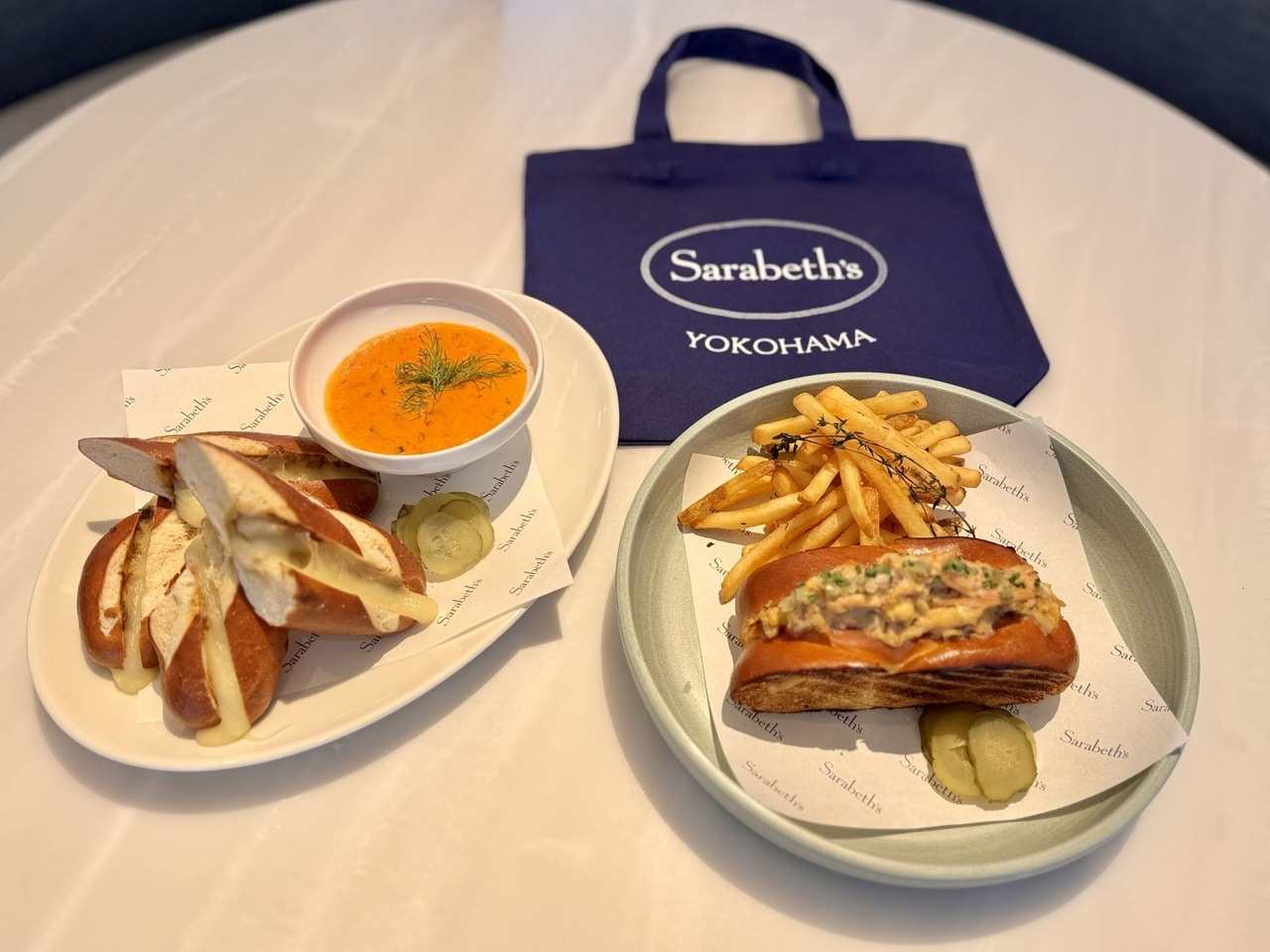 「プレッツェルチーズサンド」は、カリッと香ばしいプレッツェルブレッドに、甘く炒めたソテーオニオンと、とろけるグリュイエール&モッツァレラチーズを挟んだホットサンド。やさしい酸味のトマトスープとセットで提供され、チーズの濃厚さとスープのさっぱり感が絶妙にマッチするランチにぴったりの一品です。