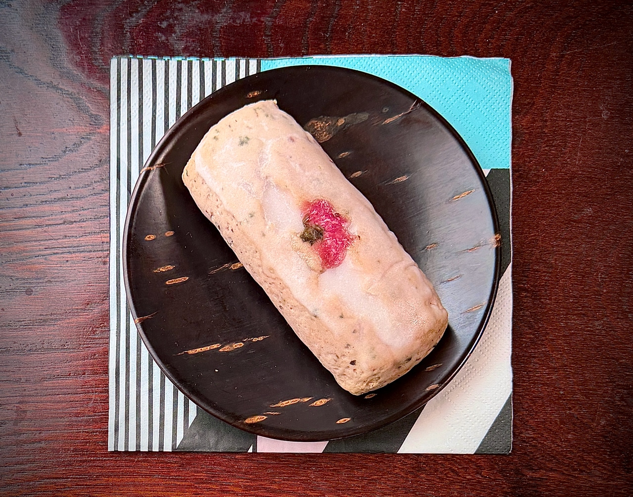 レジのスタッフの方激推しの一本でした。少し塩味の利いた、気持ちしっとりめのスコーン。桜ソースと桜葉ミンチが入っているらしく、生地そのものは葉のさわやかな味と香りが強めに感じました。アイシングの中央に乗った塩漬けの桜の花で、桜度プラス1!