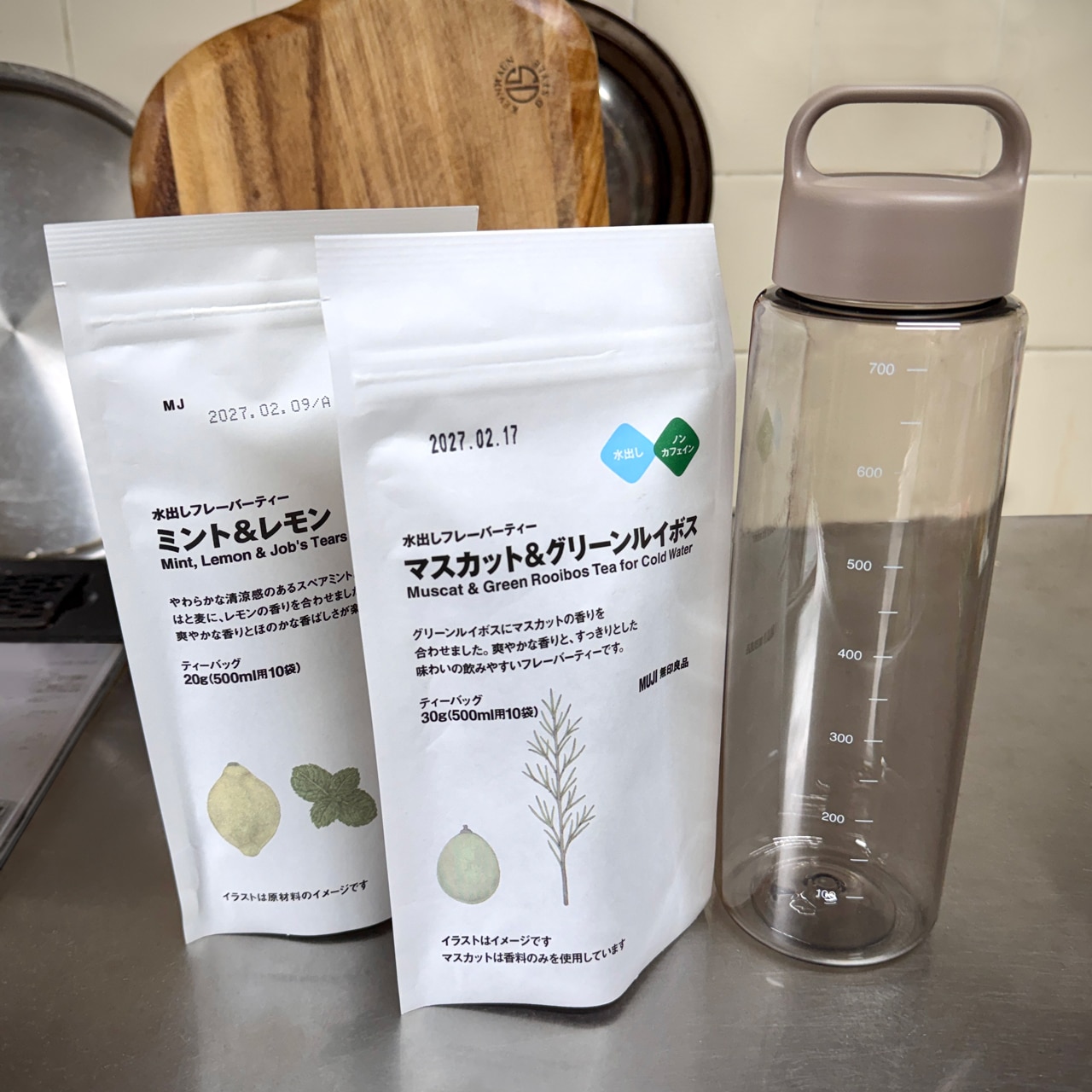 そろそろ暖かくなるし、冷たい飲み物を常備しておきたいところ…と手に取ったのがこの水出しフレーバーティ2種類。どちらも香りはとても華やかですが、甘さはなくすっきりとした味わい。「甘いものを控えたい…けど口が食べたい…」というような時の気分転換にもよさそうです。ついでに700mlの入る大容量ボトルも新調しました!