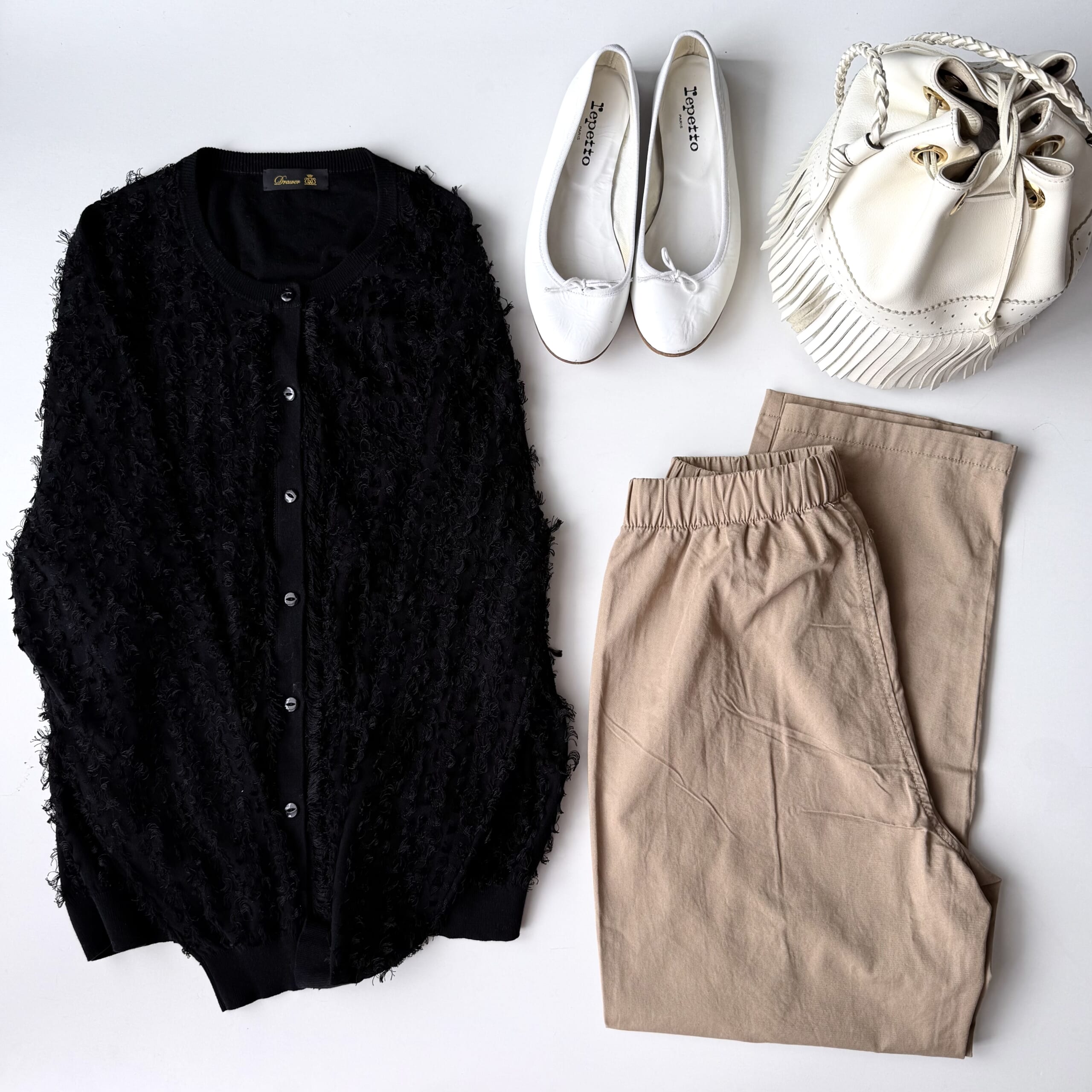 黒+ベージュ+白のコーデです。この組み合わせが程よく大人っぽく、シンプルだけど気分が上がる配色のコーデで気に入っています。