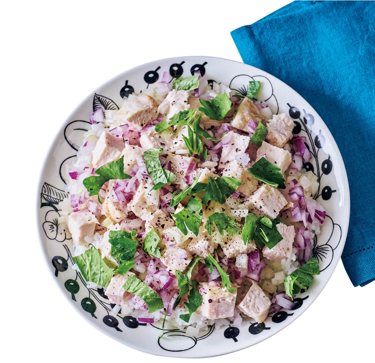 寿司めしにライム果汁を使い、セロリと紫玉ねぎをたっぷりのせたエスニック風の混ぜ寿司。自家製サラダチキンでボリューム満点。ひとりランチにも、おもてなしにも活躍します。