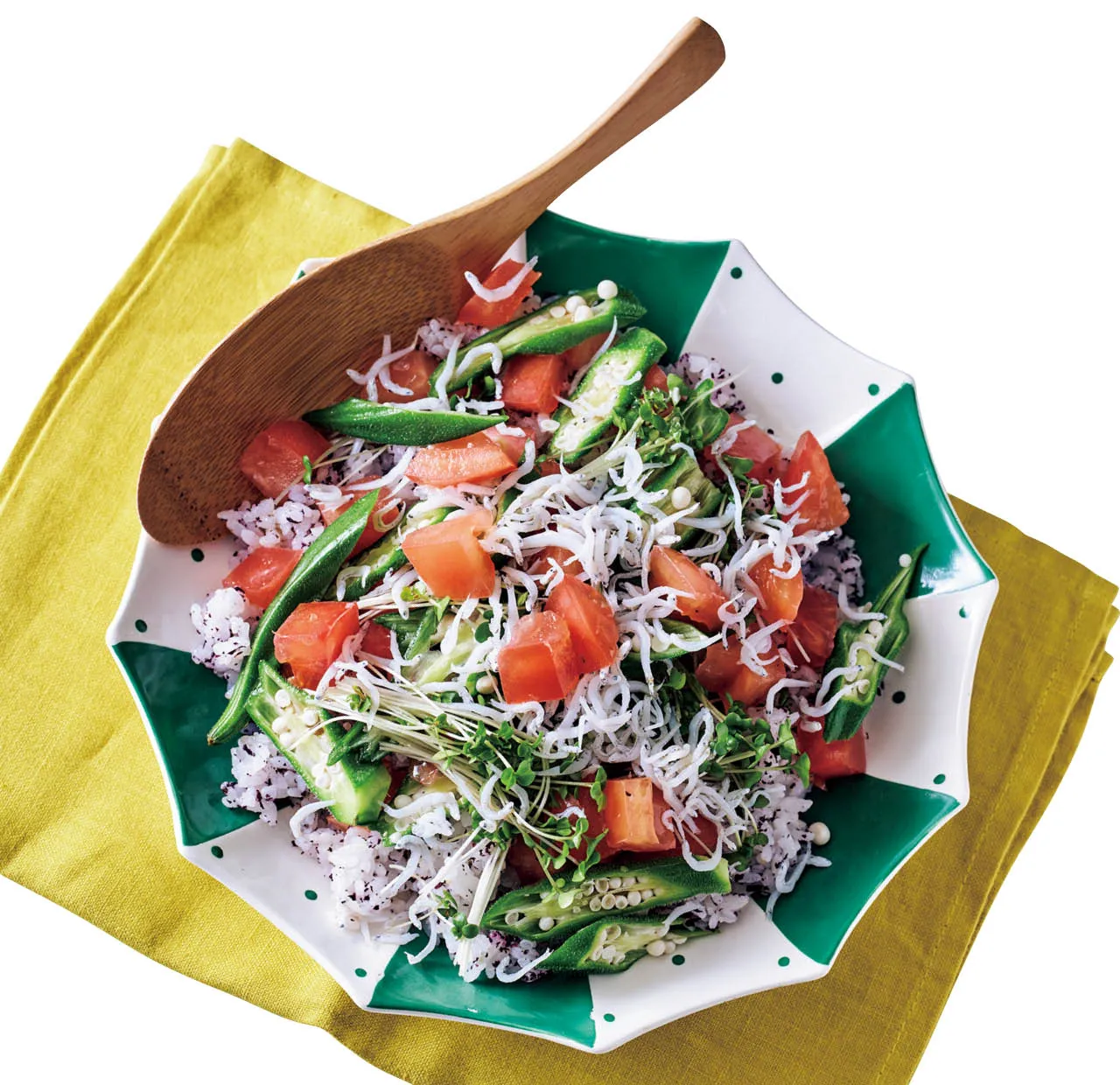 赤じそふりかけを混ぜるだけで寿司めしが完成する、手軽さが嬉しいちらし。オクラ、トマト、ブロッコリースプラウト、シラス干しをのせ、仕上げにごま油を回しかけて。普段のランチを格上げしてくれる一品です。