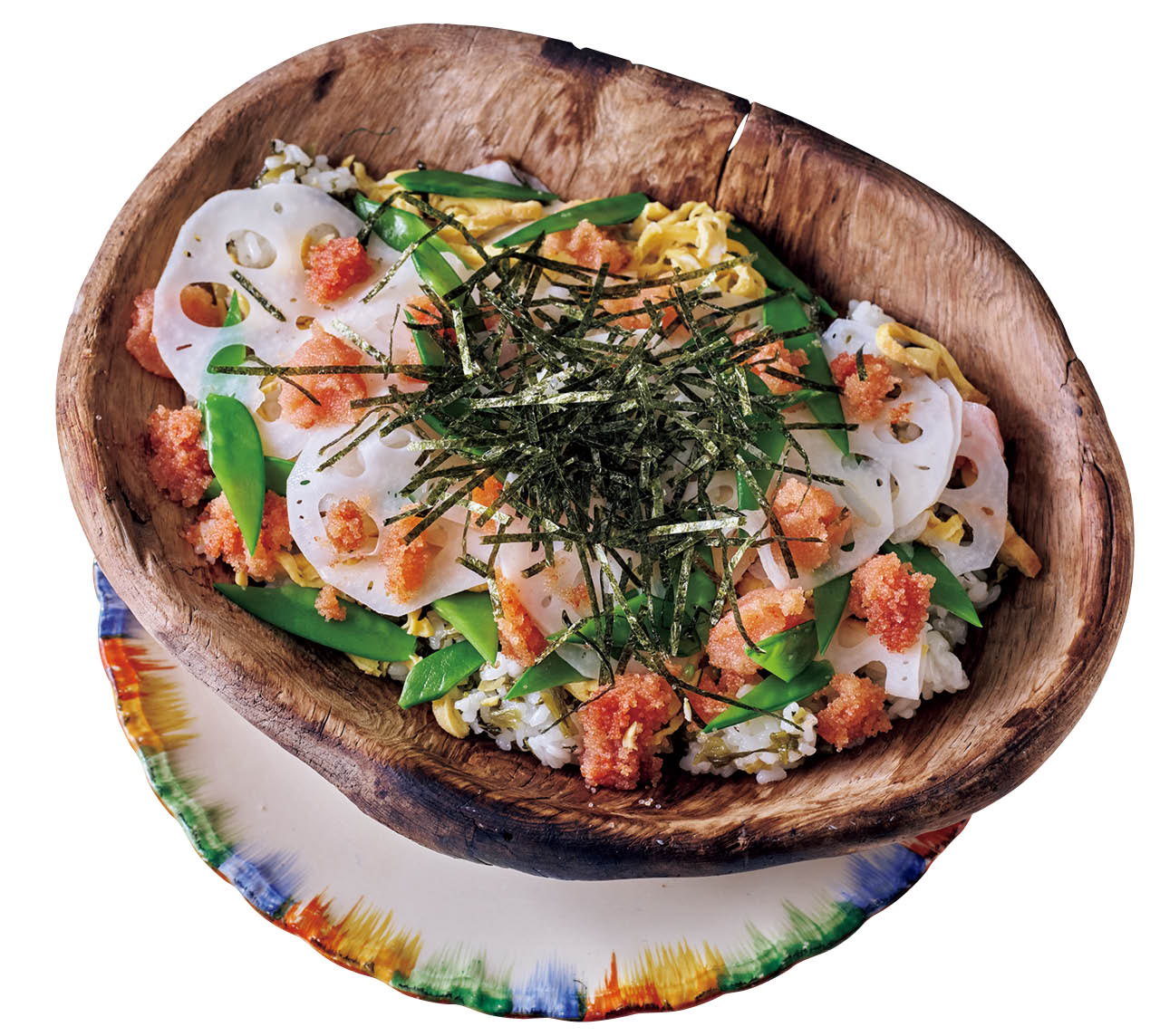 高菜漬けを混ぜ込んだ、〝それだけでおいしい〞寿司めしに、食感のいい具材をのせて。ドット状に散らした明太子がアクセントに