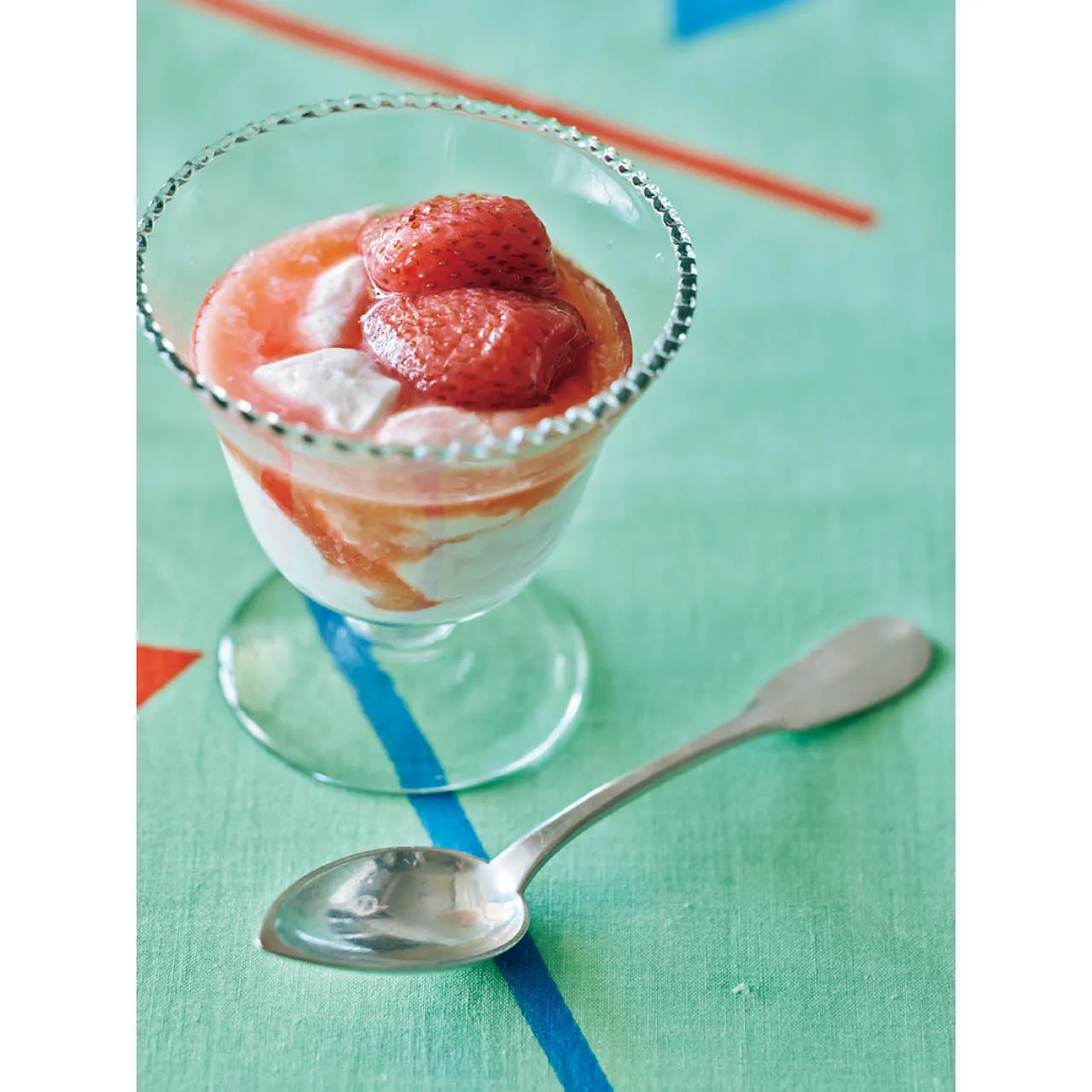 みりんと水で煮たいちごをギリシャヨーグルトにかけるだけのシンプルデザート。いちごのやさしい甘みとヨーグルトの酸味が相性抜群。好みで粗びき黒こしょうをかけるのが長谷川さん流。