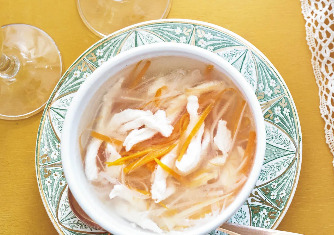 千切りにした鶏むね肉、にんじん、セロリ、長ねぎを煮込んだフランス家庭料理風のスープ。鶏皮をだし代わりに使うひと工夫でコクのある仕上がりに。