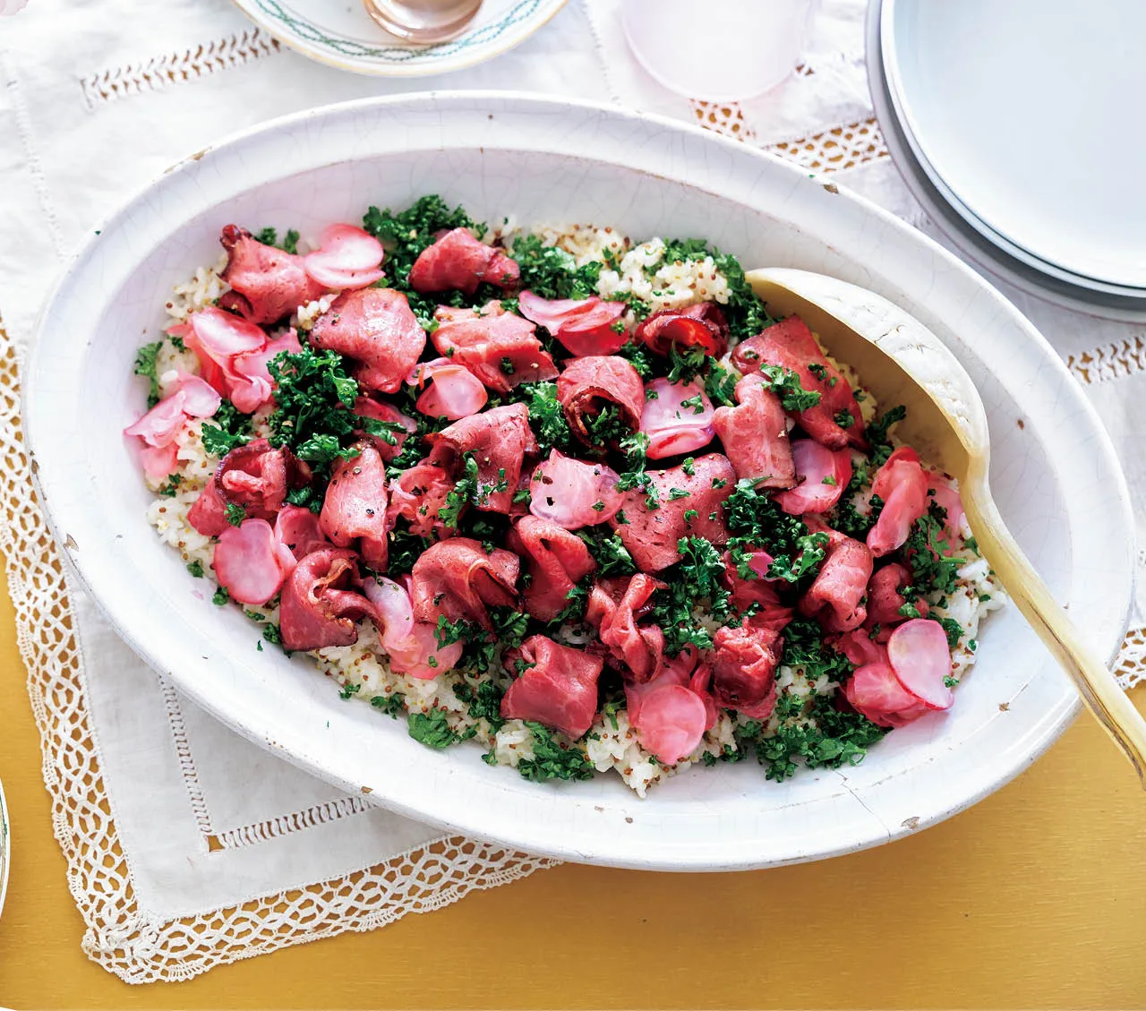 たっぷりのパセリにのせたローストビーフと酢漬けのラディッシュが、ピンク色の花畑のよう! 粒マスタードが味わいのアクセントに
