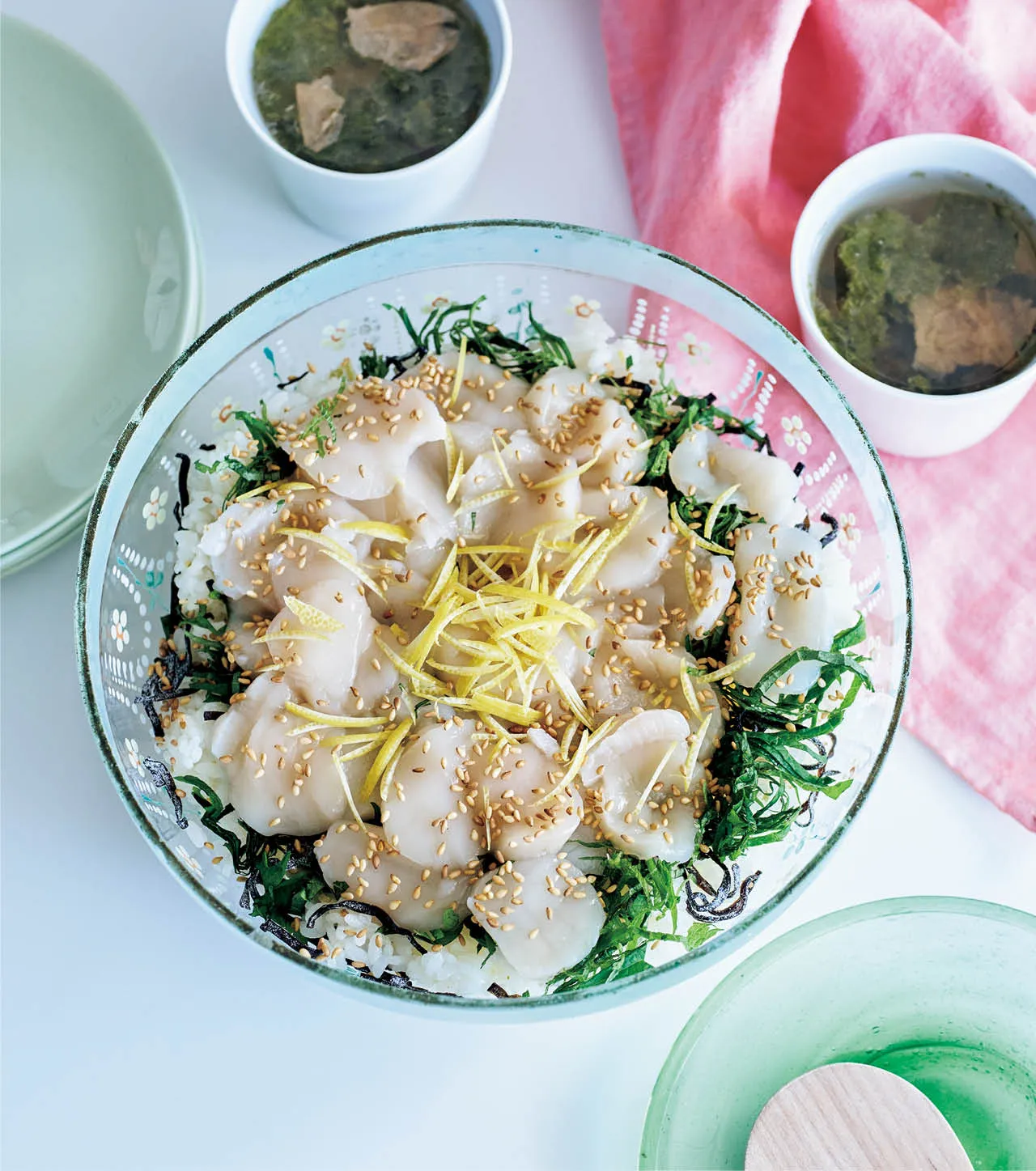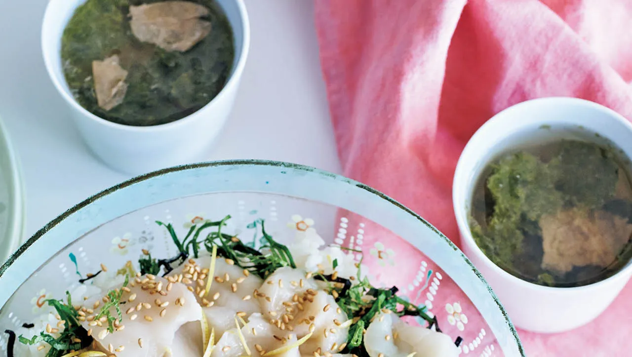 「ホタテと柚子こしょう、塩昆布のちらし寿司」、汁もの「梅とナンプラーとノリのスープ」レシピ/ 長谷川あかりさん
