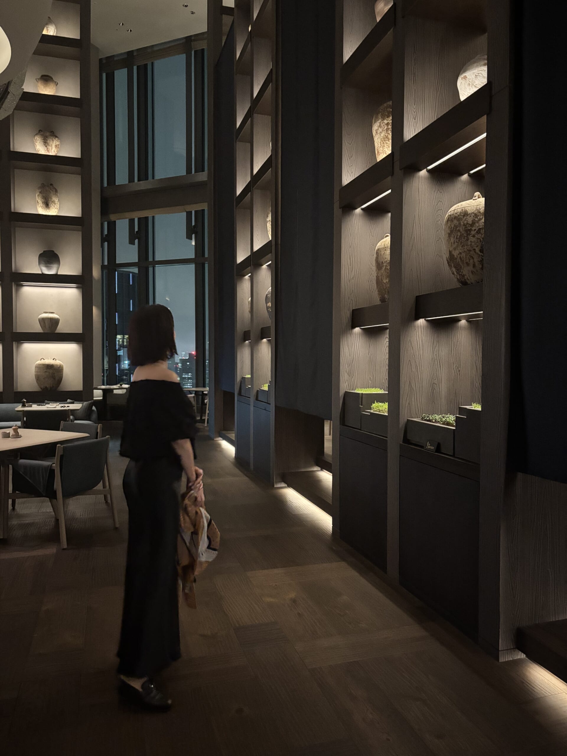 ラグジュアリーなホテルでのディナーは、艶感のあるタイトスカートでドレッシーに
