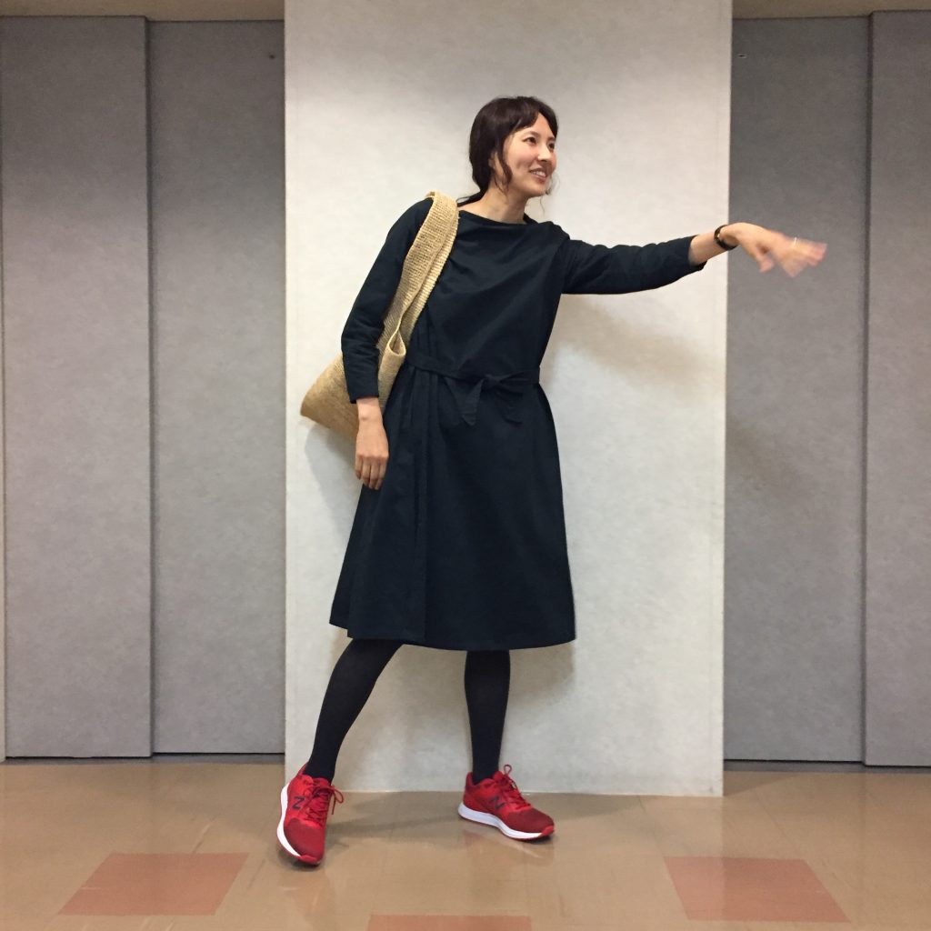 黒のワンピースと濃いグレイのタイツを合わせて、赤のスニーカーが目立つように「紅一点コーディネート」にしてみました。