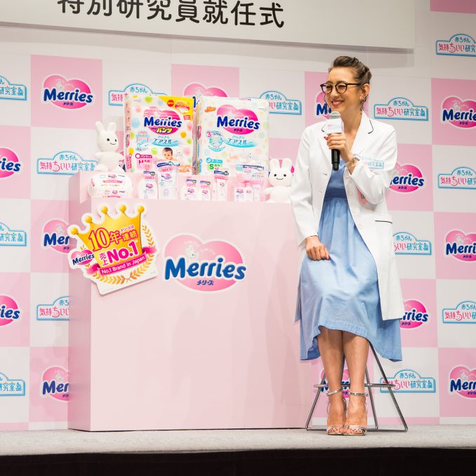 就任式にて「考えてみれば、赤ちゃんはお風呂の時間以外、ずっとおむつに触れているんですよね。通気性、履き心地にもこだわりたい」と語るSHELLYさん。ちなみに、娘さん用に使っているおむつは「ずっとメリーズ」だそう。「友達に『とりあえずおむつはメリーズね!』とアドバイスされて」と、先輩ママの影響で使い始めたエピソードを披露していました。