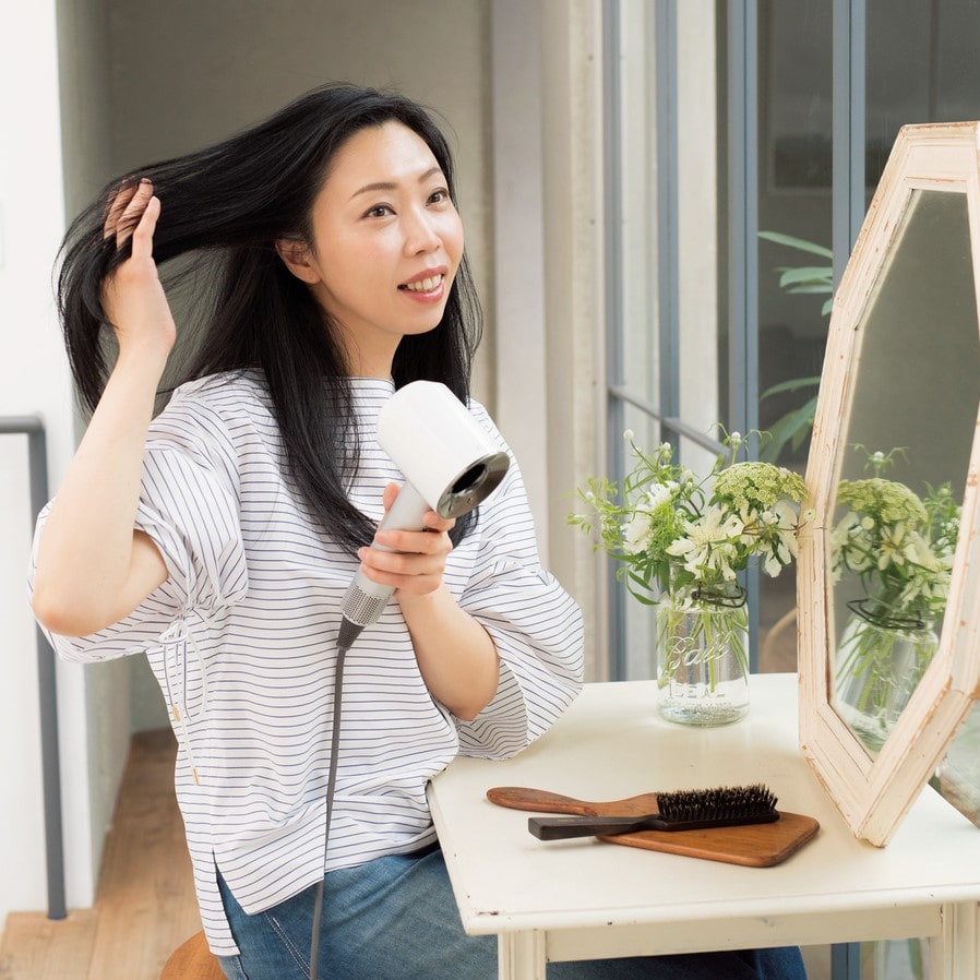 「毛量が多いので、ドライヤーは風量重視。ダイソンは髪が熱くなりすぎないようにセンサーがついているので、熱ダメージなく乾かせるんです。以前は8 分かかっていたドライが、5分以下に短縮。風力でクセがのばせるところもうれしい」。弱風も調整可能に進化した。ホワイト/シルバー ¥45000