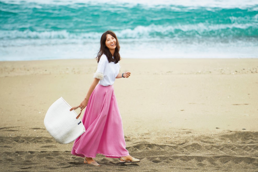 「このピンクのスカートはとても印象的なので、着こなしがたとえシンプルでも、ほどよく女らしくまとまるんです。今日は合わせるアイテムを白&ゴールドのクリーンなカラーで統一。足元をぺたんこなサンダルにして緊張感をゆるめ、休日の海を楽しむリラックススタイルに」