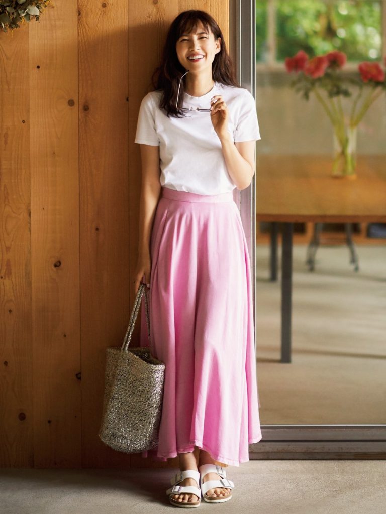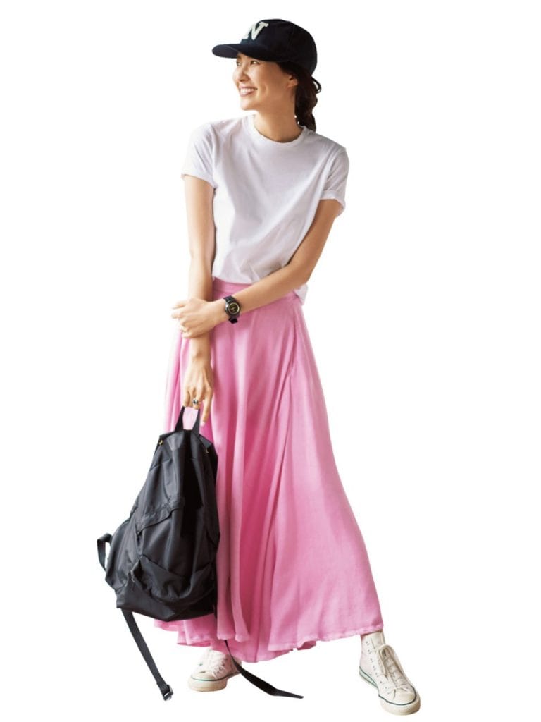 出番が多い「シンプル白T」×「ピンクのマキシスカート」