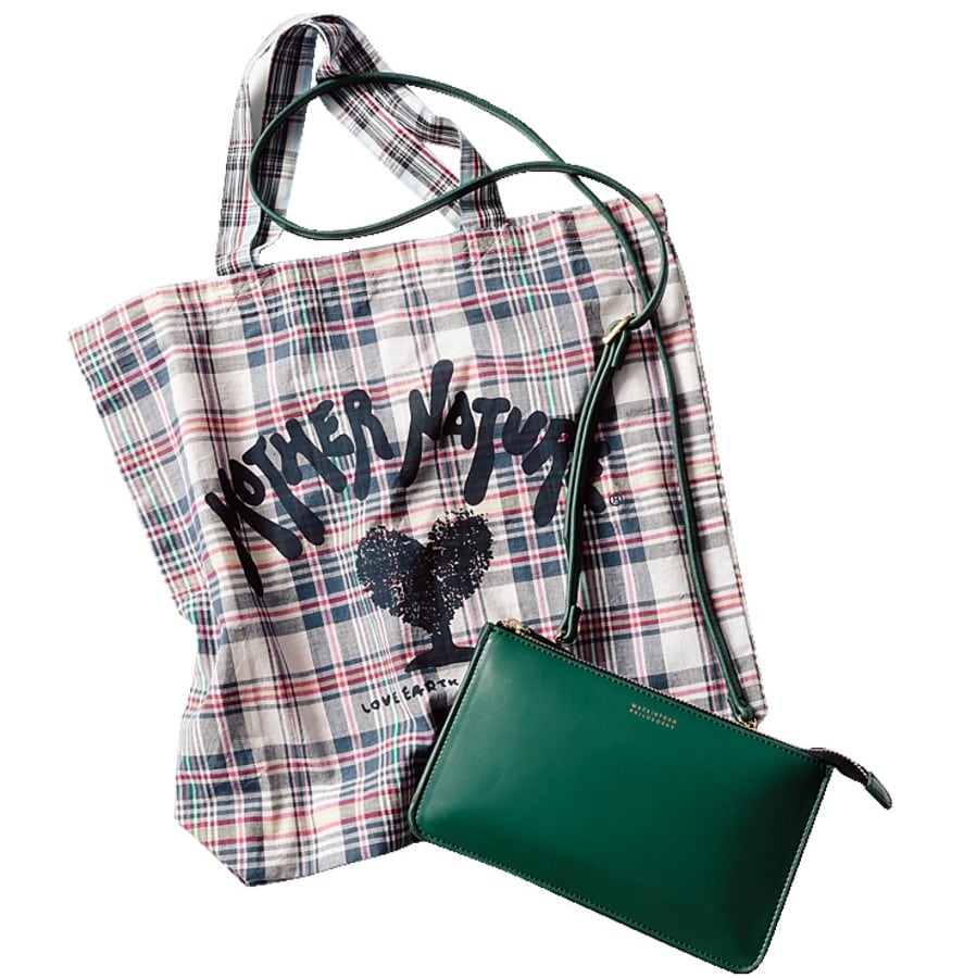 ダークグリーンは、カーキ感覚で使えて今どきな旬カラー。ほんのり色を足したいときに重宝。ポシェット(10×20.5×10)(7月末入荷予定)¥18800/ショールーム セッション(ヤーキ) トートバッグ(35×34×11)¥6800/シンゾーン ルミネ新宿店
