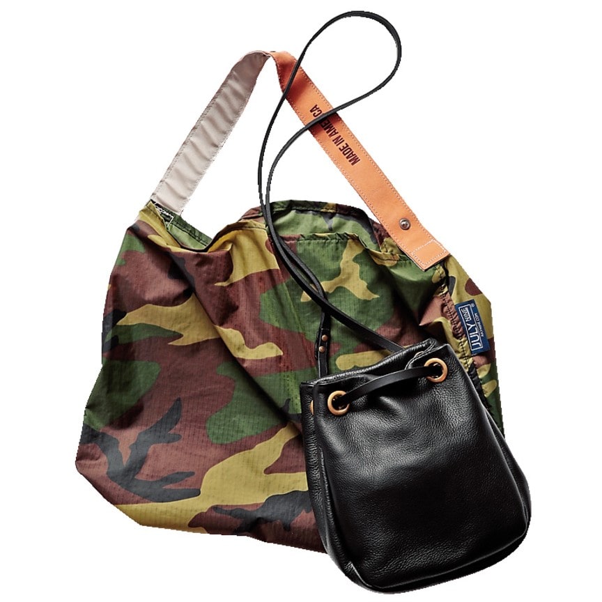 迷彩柄で辛口に。やや重厚感のある黒ポシェットには、このくらいさりげない色リンクが有効。ポシェット(18×15.5×9)¥27000/マッキントッシュフィロソフィー 新丸ビル店(ミミ) トートバッグ(35.5×44×13)¥4000/ザ コモン テンポ 原宿