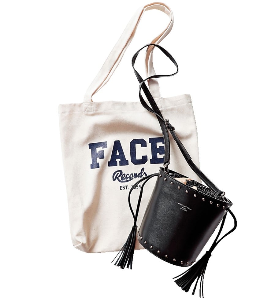 きれいめなバケツ型を適度にカジュアルダウン。ネイビーロゴならコントラストがつきすぎず、どこか優しげ。ポシェット(17×17×15)¥22000/パリゴ 丸の内店(クリスチャンヴィラ) トートバッグ(38.5×38×5.5)¥1472/フェイスレコード