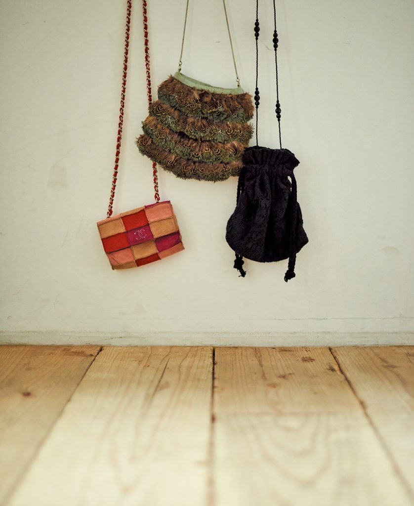 「出産前は、こんな本当に小さいバッグしか持っていませんでした。右からふたつは10代の頃買ったバッグ。左のバッグも10年以上前のもの。最近は子供のものを持たなくてもよい日が増えて、引っ張り出して使っています。不思議と、今年買った服たちとも相性がよいのです」