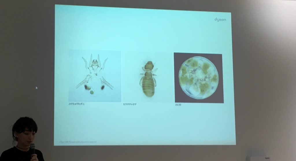 ダイソンのセミナーにて。湿度、温度が高い今の時期はダニたちにとって天国。このような生物が布団で増殖する可能性があるのだとか……。