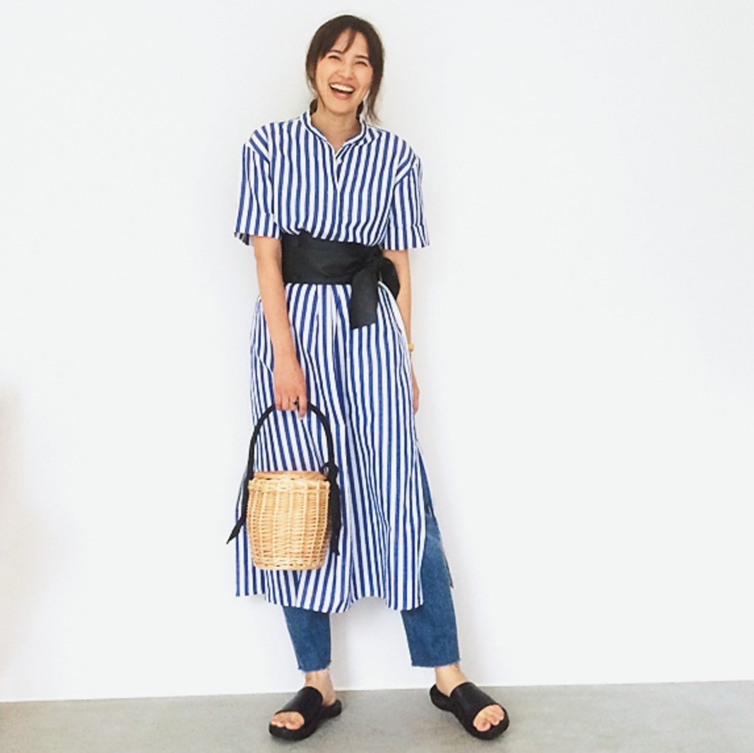 「さわやかなストライプワンピの印象を引き締める黒のサッシュベルトを加え、ぐっとクールに。深いサイドスリットが入っているので、ボトムをレイヤードしても重たくなりません」