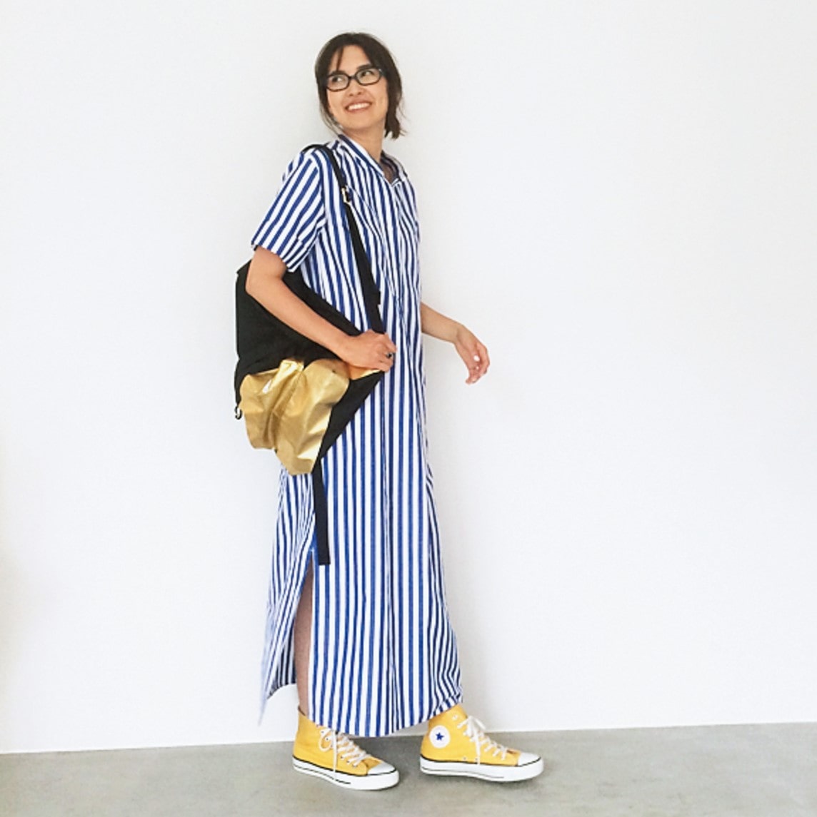 「ゴールドリュックにイエローのコンバースと、個性派小物をさすときは、ウエストリボンなしのシンプルな着こなしを。さっと脱げるワンピは、試着が多いセール時の強い味方(笑)」