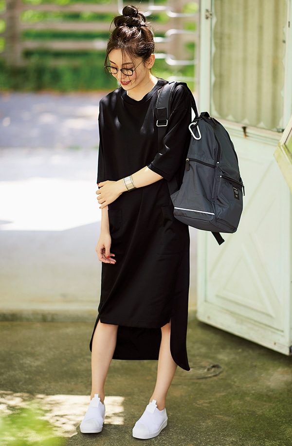 旬の洗練カジュアルが楽しめる 黒ワンピース を、ひねりの効いた白スリップオンで涼しげに