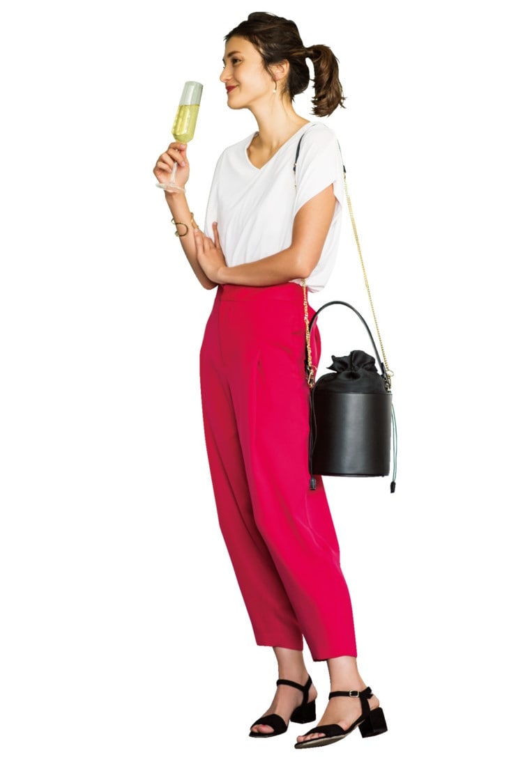 女子ウケ抜群の旬カラー、ピンクのパンツでいつもよりはじけた印象に。白ブラウスのレフ板効果で、顔まわりに明るい透明感もプラスして。