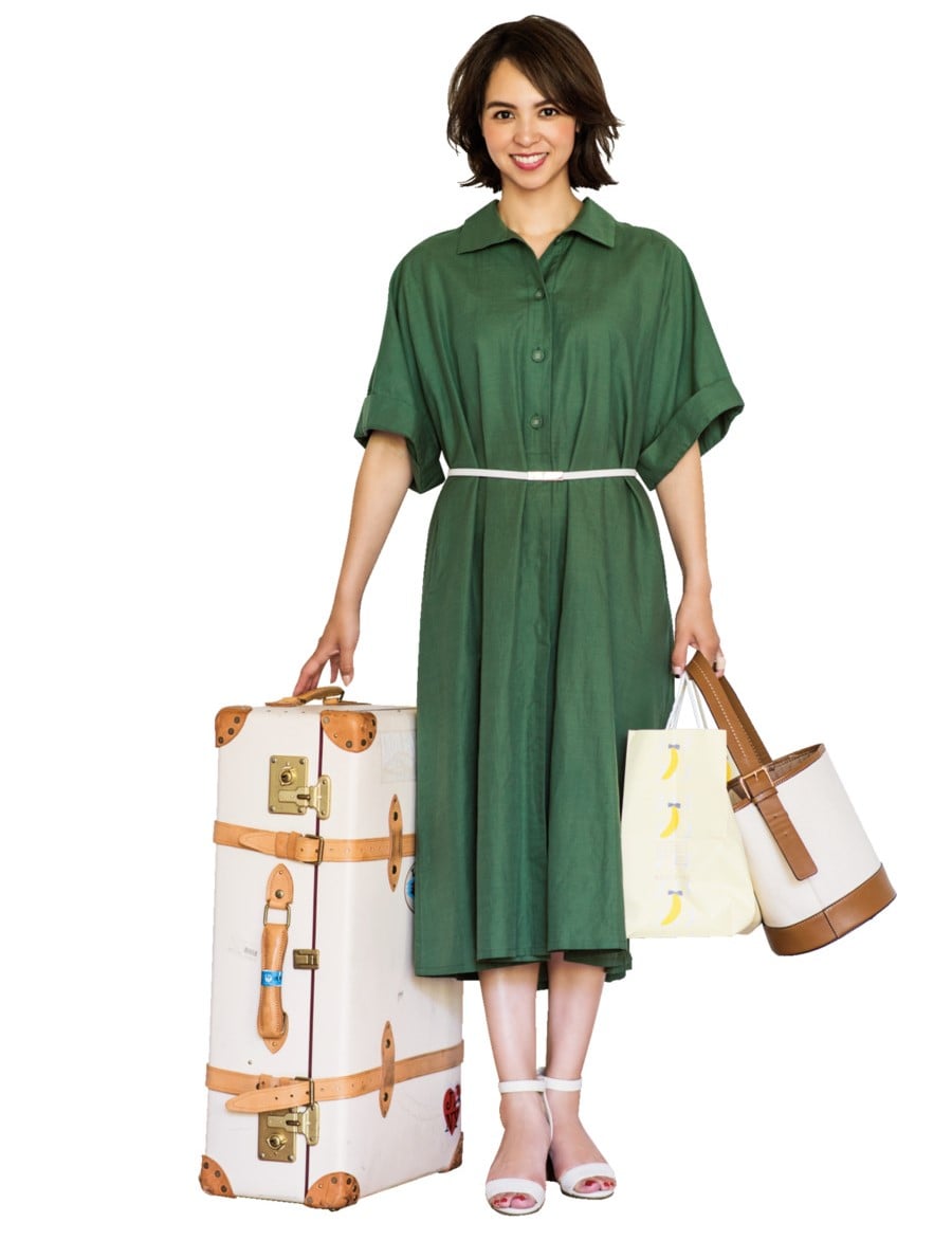 ワンピース¥26000/ハリス(ハリス グレース) ベルト¥13000/SANYO SHOKAI カスタマーサポート(アマカ) バッグ¥7900/アンビリオン(カカトゥ) サンダル¥22000/ストラ スーツケース/スタイリスト私物