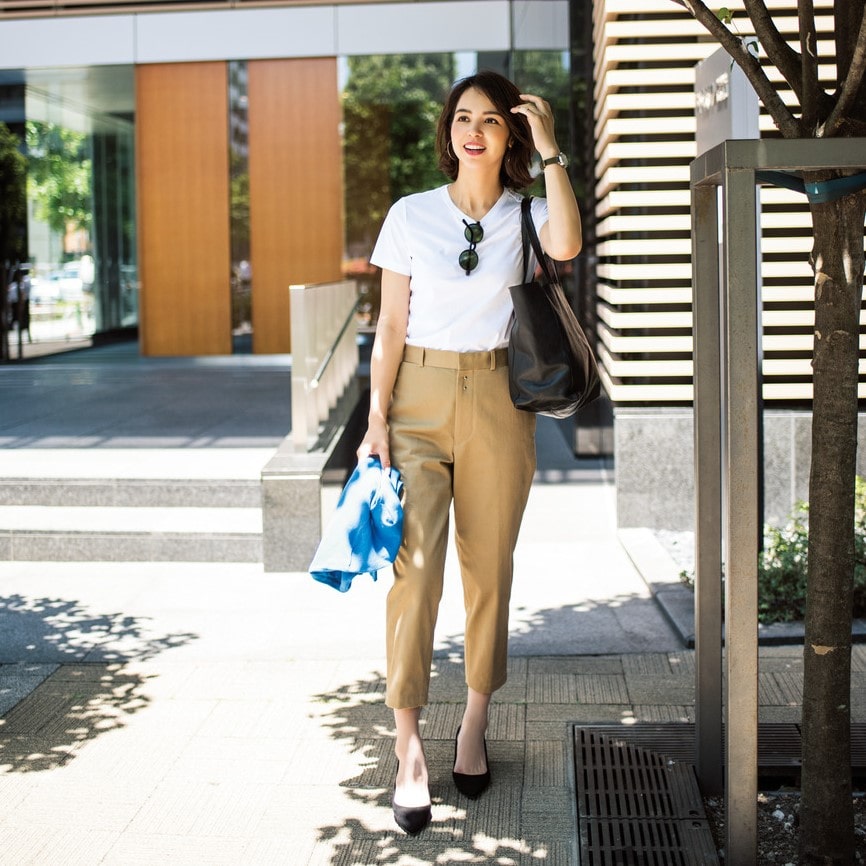 Tシャツ¥9000/SANYO SHOKAI カスタマーサポート(マッキントッシュ ロンドン) パンツ¥26000/マスターピースショールーム(サイベーシックス) ピアス¥15000/エルゴット(クレデュ クレ) サングラス¥30000/サンライズ(エル・ジー・アール) 腕時計¥13500/アウトドアプロダクツカスタマーセンター バッグ¥42000/トリッペン・チーバ二子玉川ライズS.C. 店(チーバ) 手に持ったカーディガン¥3900/キャン(ルノンキュール)パンプス¥7900/イーボル(イリマ)