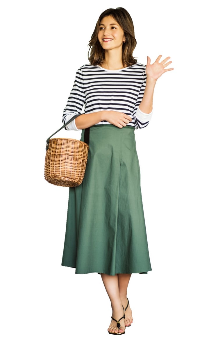少々お行儀が悪くてもカバーできちゃうロングスカート。ボーダーでさわやかさも