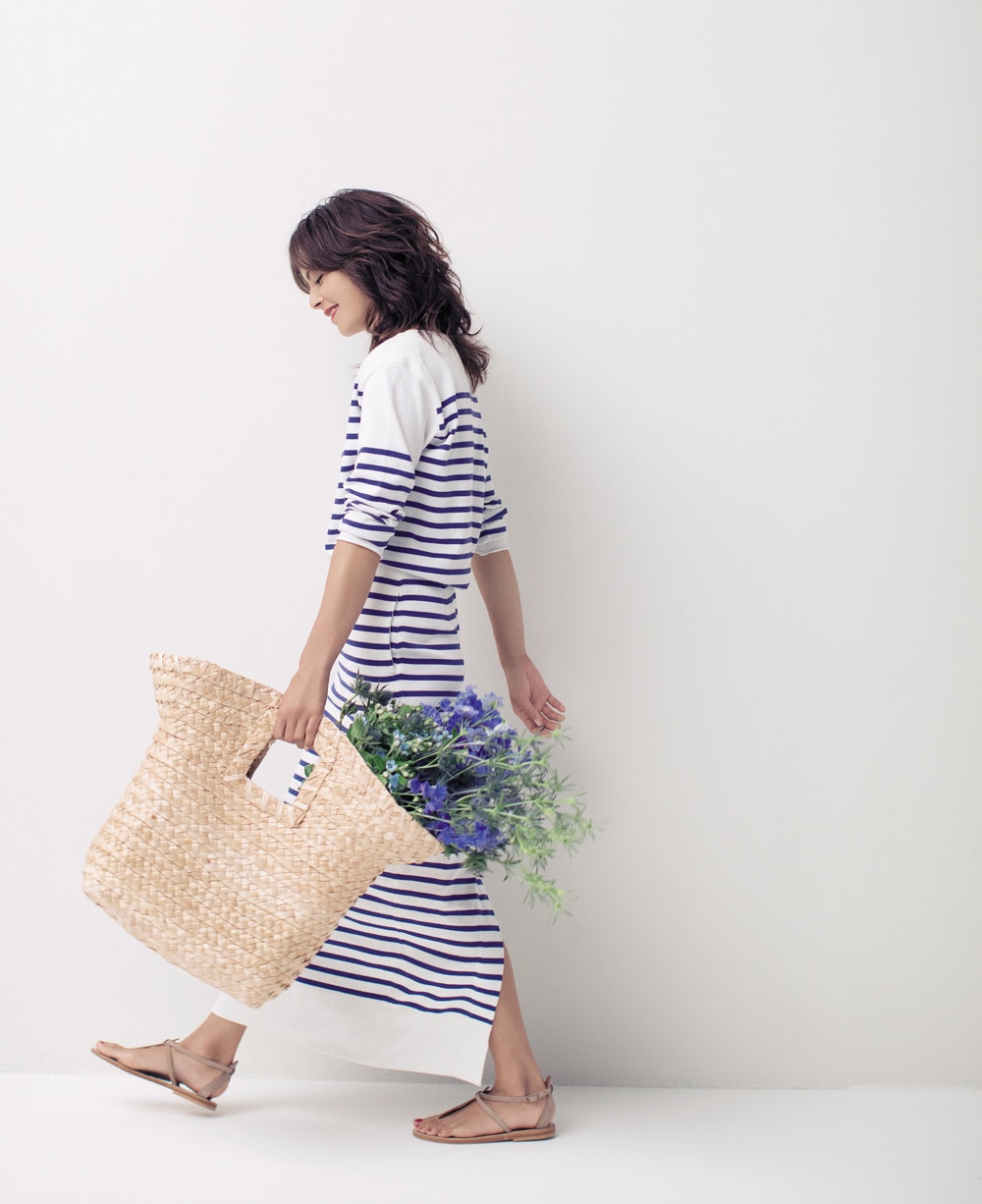 パリジェンヌたちがよりシンプルに、より女性らしくなっていると感じて、ボーダーも思いきってスカートのセットアップにしてみました。かごバッグとヌーディなサンダルは、パリの定番のエッセンス。ボーダーが新鮮なので、小物はパリらしい定番を合わせました。