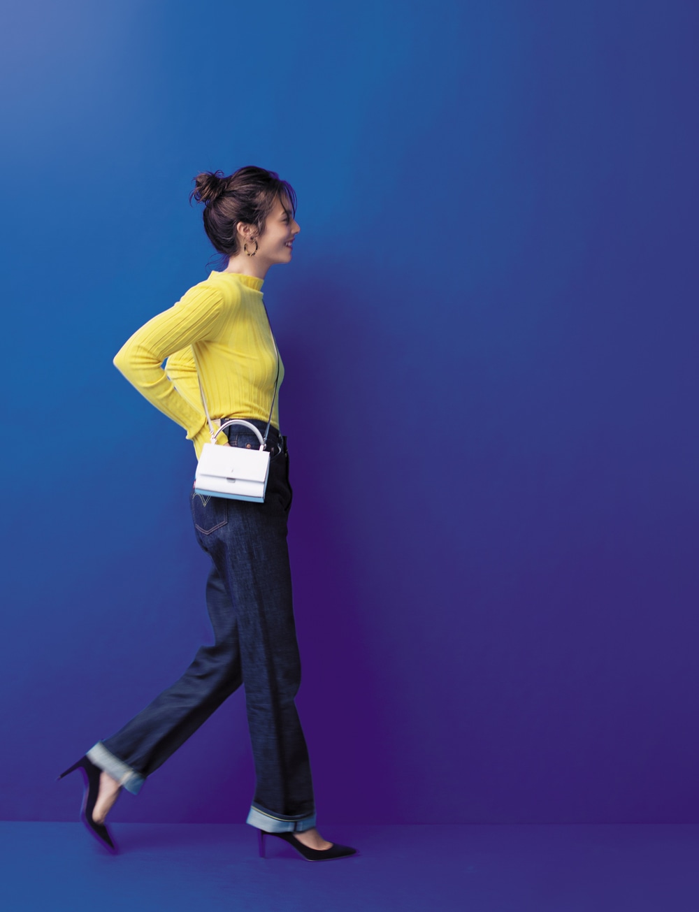 パリの人に影響され、猛烈に新しいデニムでのコーディネートを提案したくなりました。選んだのは、ハイウエストのリジッドデニム。このとびきりボーイッシュな一本は、女性が着るから素敵。きれい色トップスに小ぶりショルダーにヒール靴。大人がシンプルで着映えるって、こういうことかな。