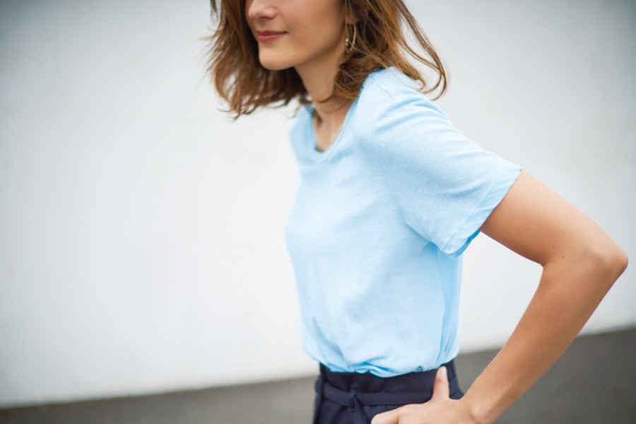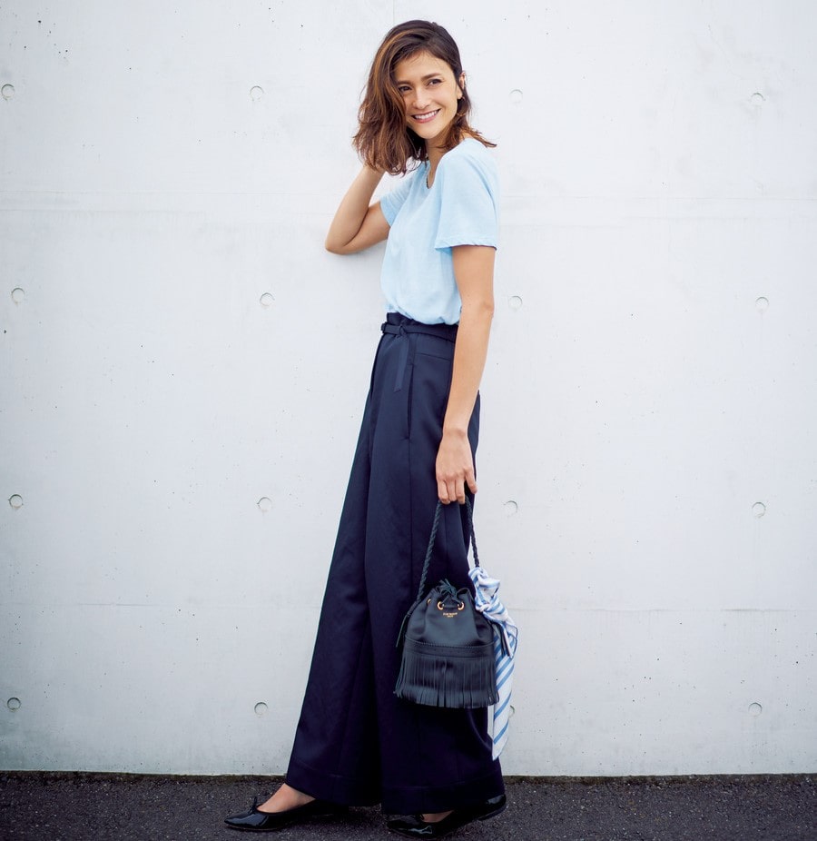 ボトムが端正なだけに、地味に見えないよう、トップスは夏らしい涼しげなブルーを。少しゆとりのあるサイズを選べば、こなれ感も手に入ります。