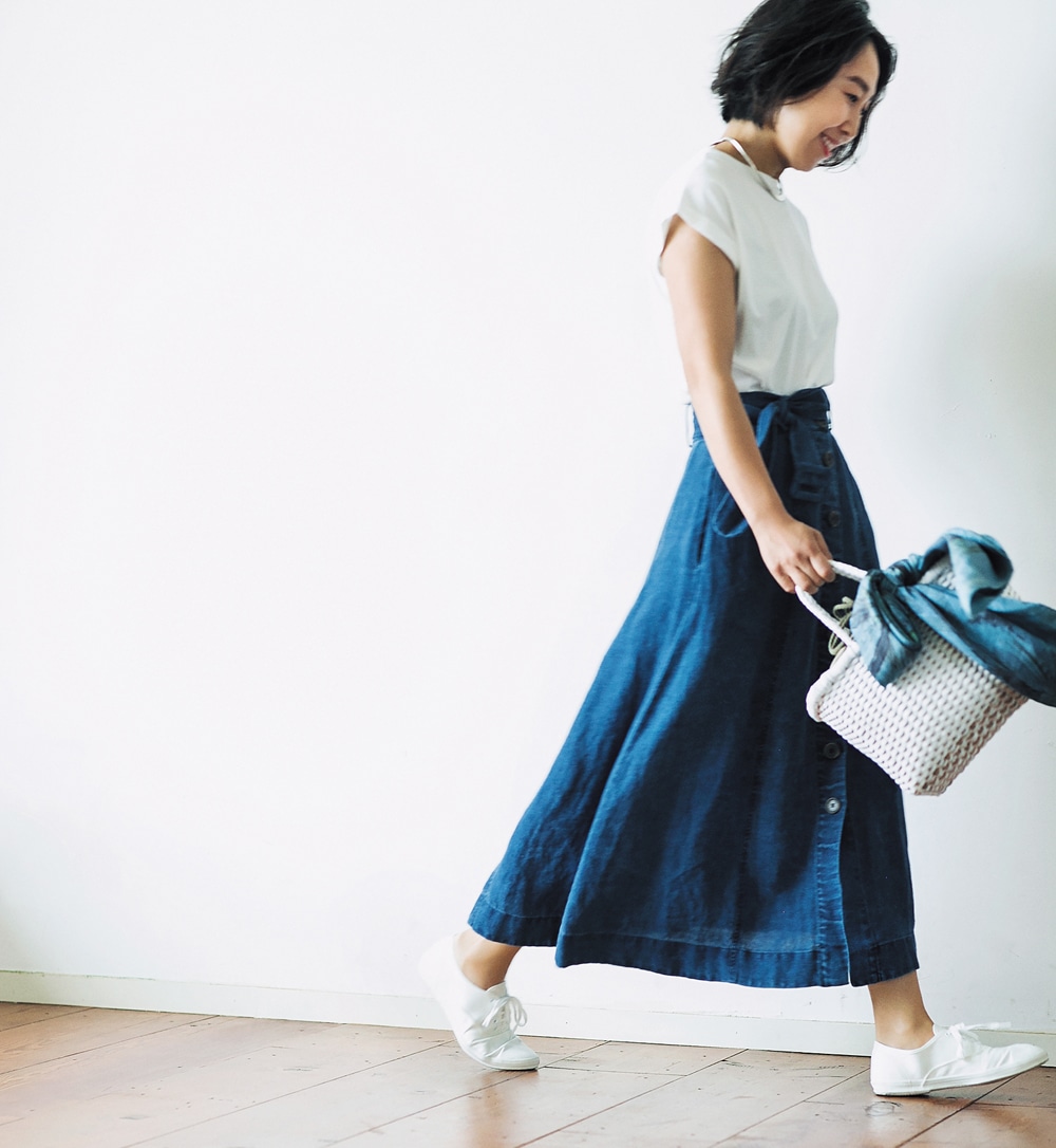 白とブルーだけの2色使いで、夏らしい爽やかさのあるスカートスタイルを作ってみました。仕上げにシルバーのチョーカーを首元にあしらうだけで、ぐっときれいめ感がアップします。by 福田麻琴