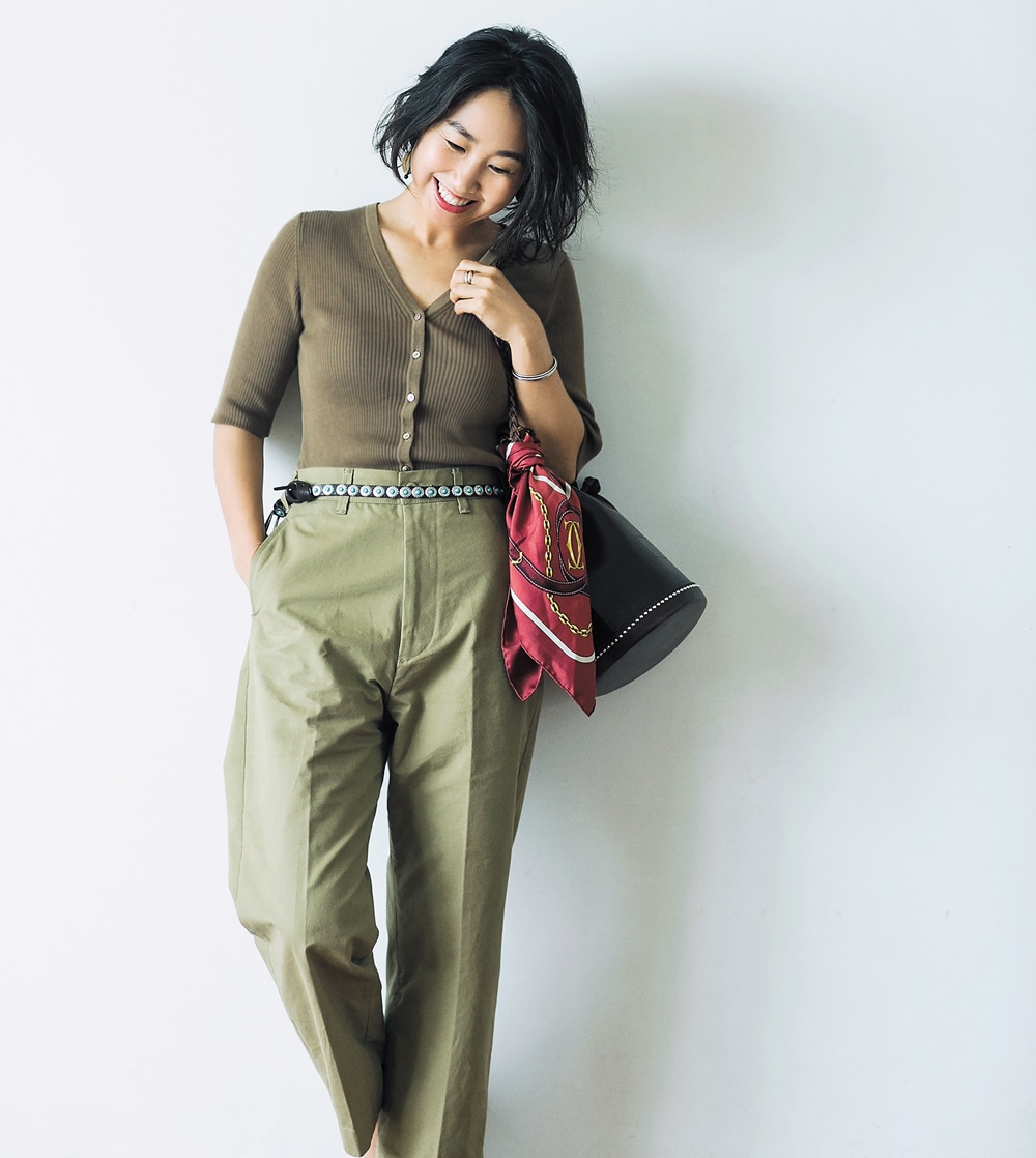 ベージュ〜ブラウンへとつながる、今年らしさ満載のコーディネート。“おやじ”っぽい色みから生まれる女っぽさがたまりません。リップとスカーフで、ブラウンと相性のいい赤をきかせて。by 福田麻琴
