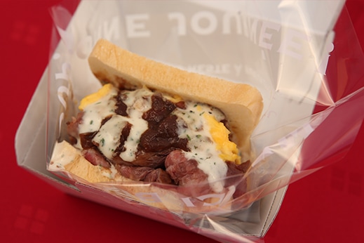 中目黒、目黒川沿いにあるお店は、素材にこだわるシェフの美しいフランス料理が食べられるお店。一皿一皿が芸術品のような料理それぞれにパンを合わせる「パンペアリング」という手法をとっています。フェスティバル提供のメニューも、「パンペアリング」にこだわるシェフならではのもの。ふんわりのスクランブルエッグ、赤ワインソースとガーリックチーズソースのダブルソースで仕上げた十勝ハーブ牛の厚切りローストビーフのクラブサンド! 一口ほおばれば、口中で究極の「パンペアリング」が楽しめること間違いないですね。