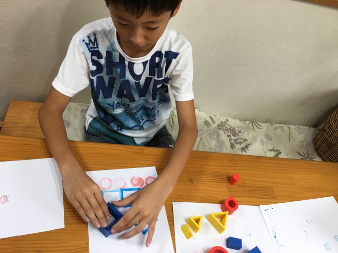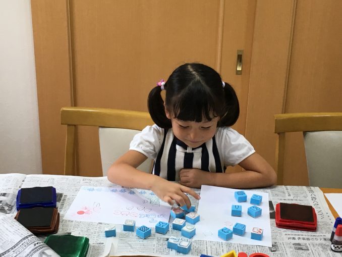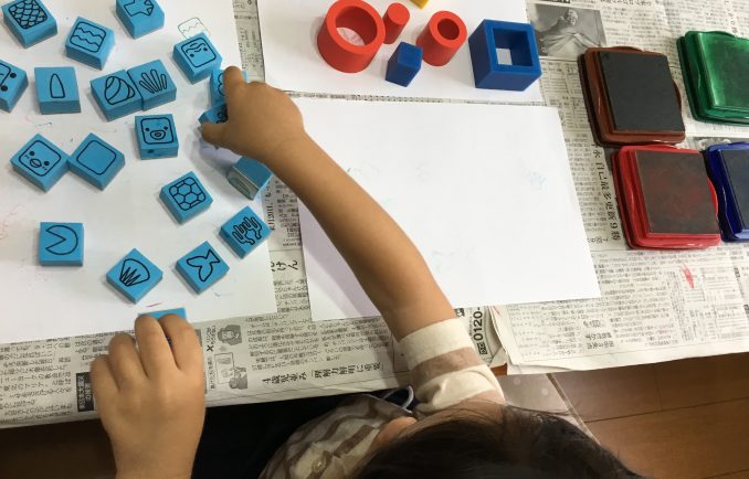 3歳児に比べると、直感のみでスタンプを押すというよりも、作品としての完成度をも意識している印象を受けました。仕上がりは個人の感性によるところが大きいのでしょうが、幼稚園に通う園児としての社会性も感じましたね。