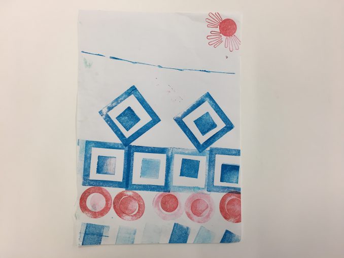 タイトルは「電車」。太陽の一部分には「エポンテ どうぶつスタンプ」の一種類を使っていましたが、他は「エポンテ カタチスタンプ」のみ。