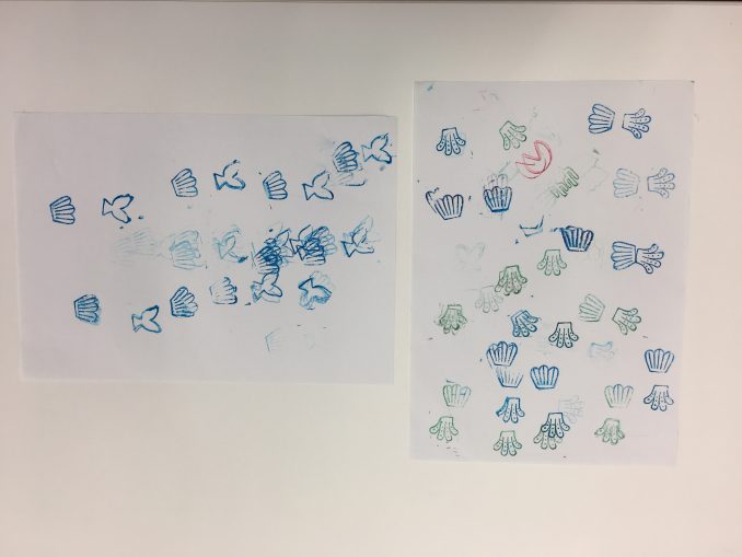 今回は平面に押すのみでしたが、スタンプを押した紙を使って、立体パズルや釣りゲームの紙おもちゃ、クリスマスのツリーや帽子などなど、アイデア次第でいろいろなものが作れそう。
