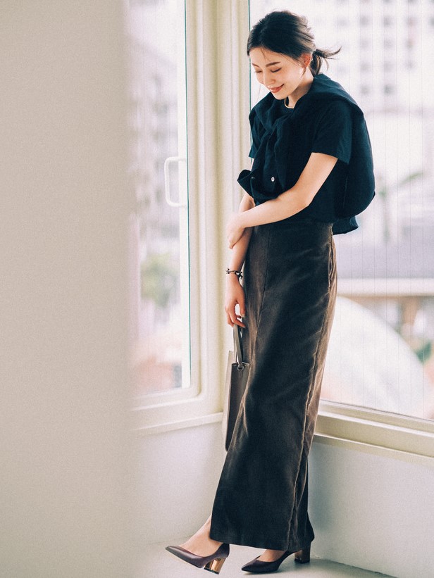 パンプス(5)¥34000(エクストローディナリージェーン)・バッグ¥19800(ヤーキ)/ショールーム セッション Tシャツ¥5800/シンゾーン ルミネ新宿店(ザ シンゾーン) シャツ¥42000/マディソンブルー スカート¥28000/オーラリー チョーカー¥22000/アングローバルショップ 表参道(アイジーダブルティー) ブレス(2本セット)¥8500/ココシュニック オンキッチュ 有楽町マルイ店(エー・ヴィー・マックス)